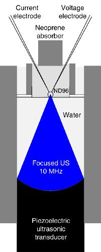 Figure 1. Measurement of currents flowing through ion channels in response to ultrasonic stimulation.A Xenopus oocyte expressing an ion channel of interest is placed in a recording bath in a chamber (see Methods), and subjected to an US pressure field generated by a focused US transducer placed below the chamber and submerged in deionized and degassed water. A neoprene absorber is immersed in the recording bath to prevent the formation of a standing wave in the chamber. Transmembrane currents are measured using the two-electrode voltage clamp. |