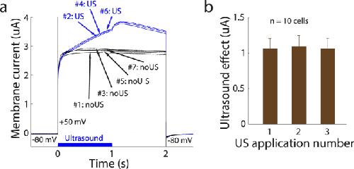 Figure 2. Robust and repeatable effects of ultrasound on transmembrane currents flowing through cells expressing TREK-1.(a) The current flowing through the membrane of an example cell as a function of time. The membrane voltage was held at −80 mV before stepping to +50 mV (time 0). After 2 s, the membrane voltage returned to −80 mV. To test the repeatability of the US effects, we alternated conditions without and with US in the following sequence: #1: noUS, #2: US, #3: noUS, #4: US, #5: noUS, #6: US, #7: noUS with a 5 s period between the repetitions. The corresponding current waveforms are labeled in the figure. In the US conditions, the US was applied at time 0 and lasted 1 s (see blue bar on the bottom). The driving US waveform was sinusoidal with frequency of 10 MHz and spatial-peak pressure amplitude of 240 kPa (2.0 W/cm2). The figure shows the raw recorded currents. (b) Mean ± s.e.m. ultrasound effect, i.e., US minus noUS currents, for the three consecutive applications of the US. The currents were measured between 1.0 s to 1.2 s following the stimulus onset. This plot is based on 10 cells using spatial-peak US pressure amplitude of 240 kPa (2.0 W/cm2) and membrane voltage of +50 mV. |