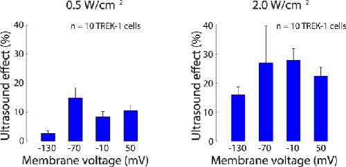 Figure 8. Ultrasound-mediated effects increase with stimulus intensity.Mean ± s.e.m. relative changes in the transmembrane currents due to US, for the individual membrane voltages, quantified in the same interval as previously. The data are shown separately for a lower (left) and a higher (right) stimulus intensity applied to separate sets of cells expressing TREK-1. |