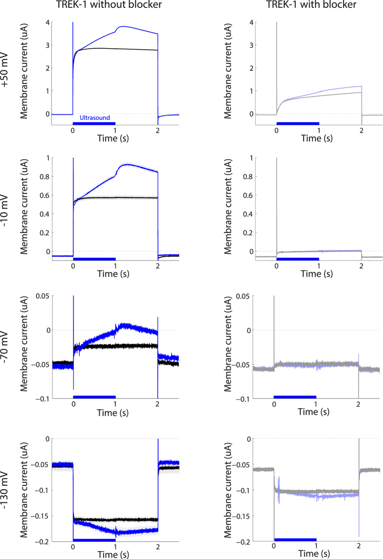Figure 3. Ultrasound-mediated currents as a function of membrane voltage, in the absence and presence of TREK-1 blocker.Mean ± s.e.m. current flowing through the membrane of the example cell as a function of time. The mean was computed over the individual US (blue, n = 3) and noUS (black, n = 4) repetitions. The individual rows correspond to the currents measured at voltage steps of +50 mV, −10 mV, −70 mV, and −130 mV. In the data in the right column, same protocol sequence was repeated following the administration of BaCl2 (10 mM) into the bath. |