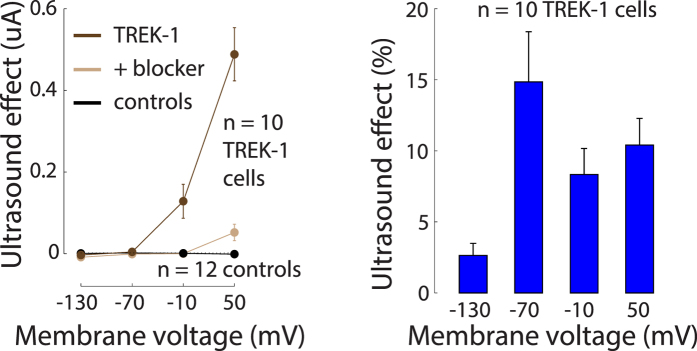 Figure 4. The effects of ultrasound on TREK-1 current.Left: Mean ± s.e.m. current due to US as a function of membrane voltage, for TREK-1 cells (dark brown; n = 10), the same TREK-1 cells with BaCl2 (10 mM) in the bath (light brown), and control cells (black; n = 12). The US stimulus pressure amplitude was 120 kPa, corresponding to ISPTA ≈ 0.5 W/cm2. The currents were measured in the same interval as previously. Right: Mean ± s.e.m. relative changes in the transmembrane currents due to US, for the individual membrane voltages, quantified in the same interval as previously. |