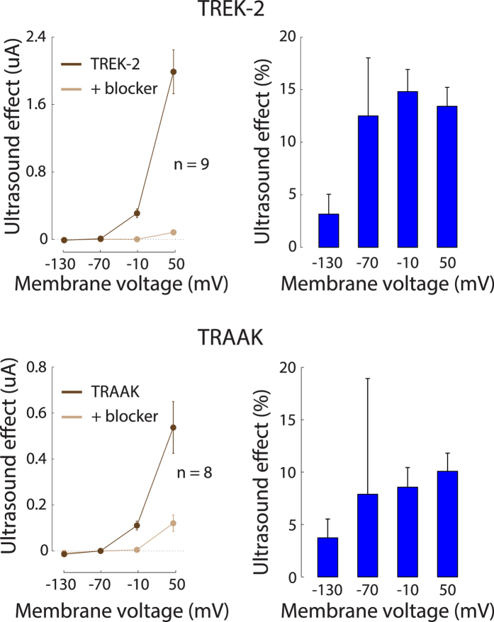 Figure 7. Summary of the effects of ultrasound on K2P channels.Mean ± s.e.m. effects averaged all holding voltages. The values are taken over the same interval as previously. The number of cells are shown below the channel labels. |