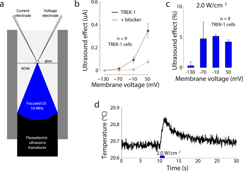 Figure 9. The effects of US on TREK-1 current when US propagates directly into the cell.(a) An alternative recording setup in which a cell is placed into a 0.7 mm opening within two thin sheets of borosilicate glass. Both the cell and the transducer share the same ND96 bath. (b) Mean ± s.e.m. current due to US (n = 9 cells) as a function of the membrane voltage, for the TREK-1 cells (brown) and TREK-1 cells with BaCl2 (10 mM) in the bath (light brown). Same format as in Fig. 4. (c) Mean ± s.e.m. relative changes in the transmembrane currents due to the US, for the individual membrane voltages. Same format as in Fig. 4. (d) Mean ± s.e.m. temperature (n = 5 recordings) of cell membrane surface measured by an infrared camera. The 10 MHz 240 kPa (2.0 W/cm2) US stimulus was applied at 10 s, and lasted for 1 s (thick blue bar). |