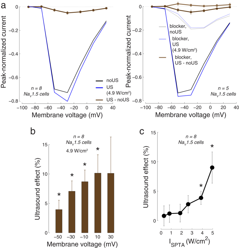 Figure 11. Summary of the effects of US on NaV1.5 currents.(a) Right panel: Average peak negative current in NaV1.5-expressing cells (n = 8) in response to voltage steps (same as in Fig. 10), separately for the conditions in which there was no US (black) and in which US was applied (blue). The currents of each cell were normalized by the cell’s overall peak negative current before computing the average over cells. For each cell, we alternated 4 noUS and 3 US conditions, and took the average within each condition. The brown curve shows the mean ± s.e.m. difference between the US (blue) and noUS (black) currents. Left panel: Same as right panel for the cells that in addition had ranolazine blocker data (n = 5). The currents following the application of ranolazine (500 μM) are shown in light colors. (b) Mean ± s.e.m. relative effects of US (100 * (IUS-InoUS)/InoUS) for the individual voltages. The figure shows effects for voltages in which currents were substantial to circumvent division by a small number (small currents at −90 mV and −70 mV). Both (a,b) used stimulus intensity ISPTA = 4.9 W/cm2. *p < 0.05, two-sided t-test, n = 8. (c) The effects of US as a function of stimulus intensity. The effects were averaged over the voltage steps; mean ± s.e.m. values over cells (n = 8) are shown. *p < 0.05, two-sided t-test. |