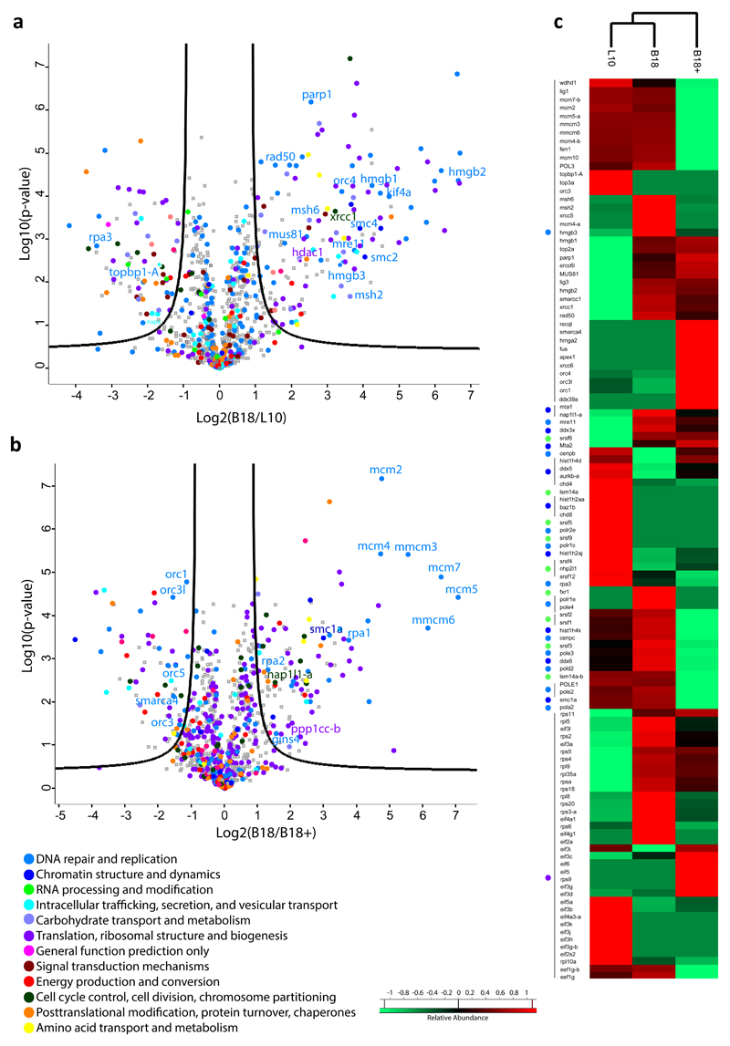 Figure 2. Proteomic analysis of replicating centromeric and non-cetromeric chromatin using label free quantitative MS.(a) Centromeric B18 and non-centromeric L10 chromatin was isolated after 150 minutes incubation of BAC DNA in egg extract and analysed by high resolution MS-MS. Volcano plots show the mean log2 protein B18/L10 ratio plotted against the p-values of biological replicates. Proteins differentially represented on centromeric and non-centromeric chromatin are shown. Black lines indicate the significance cut off. (b) Proteins differentially represented on centromeric chromatin in the absence (B18) or in the presence (B18+) of geminin analysed as in (a) are shown. Experiments shown in (a) and (b) were repeated with three different extracts (see Methods and Table S2 for statistical significance). (c) Heat map for some non-centromeric (L10) and centromeric (B18) or geminin sensitive (B18+) proteins. Chromatin enriched proteins are in red, depleted proteins in green.