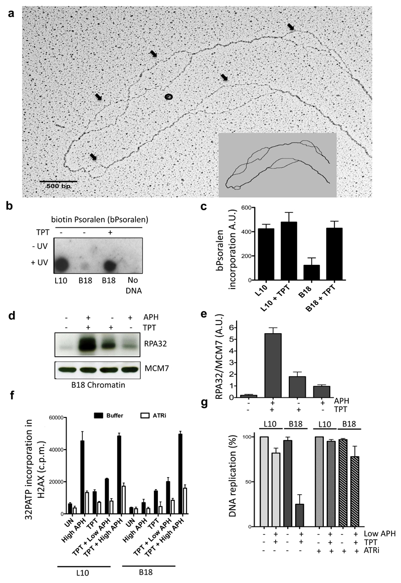 Figure 4. Overwound centromeric DNA suppresses RPA accumulation and ATR activation.(a) EM of B18 DNA isolated after 150 minutes incubation in interphase extract. Arrows indicate ssDNA bubbles. Scheme is included. Data represent 1 out of 3 experiments. (b) Streptavidin-HRP stained dot blot of L10 ad B18 DNA isolated from BAC nuclei replicated with 40 μM topotecan (TPT) or left untreated and treated with biotin-psoralen (bPsoralen) in the presence (+) or absence (-) of UV. Data represent 1 out of 3 experiments (c) Total incorporated bPsoralen was measured using a fluorescence based biotin quantification assay. Values represent fluorescence intensity expressed in arbitrary units. Error bars represent ± sd of the mean. n=3 experiments; p<0.05 when comparing L10 and B18 mean values for all treatments; One-way Anova. (d) WB of RPA32 and MCM7 bound to B18 chromatin isolated from nuclei replicated in the presence of 40 μM topotecan (TPT) and 25 μg ml-1 APH as indicated. (e) RPA32/MCM7 ratio. Error bars represent ± sd of the mean. n=3 experiments; p<0.01 when comparing B18 mean values for all treatments; One-way Anova. (f) Average incorporation of 32P in histone H2AX C-terminal peptide in the presence of nucleoplasm derived from L10 and B18 nuclei replicated in extracts that were untreated (UN), treated with 25 μg ml-1 APH (High APH), 40 μM TPT, TPT and 1 μg ml-1 APH (TPT + Low APH) or TPT and 25 μg ml-1 APH (TPT + High APH). Reactions were performed in the absence (black bars) or in the presence (white bars) of 10 μM VE-821 (ATRi). Error bars represent ± sd of the mean. n=3 experiments; p<0.001 when comparing B18 and L10 mean values for all treatments; One-way Anova. (g) L10 and B18 DNA replication in extracts treated with 40 μM TPT and 1 μg ml-1 APH (Low APH) in the presence or absence of ATRi as indicated. Relative average percentage of 32PdCTP incorporation is shown. L10 values in untreated extracts were considered 100%. Error bars represent ± sd of the mean. n=3 experiments; p<0.001 when comparing B18 and L10 mean values for all treatments; One-way Anova.