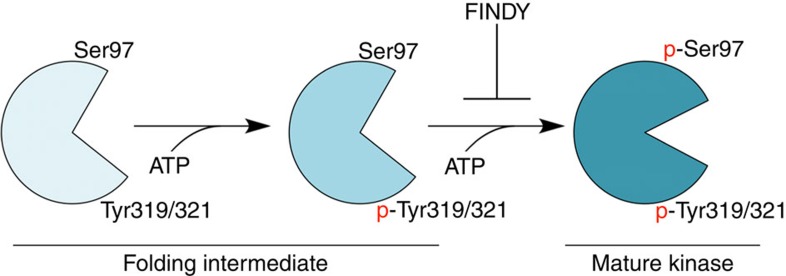 Autophosphorylation of amino-acid residues is part of the folding process of various protein kinases. Conventional chemical screening of mature kinases has missed inhibitors that selectively interfere with the folding process. Here we report a cell-based assay that evaluates inhibition of a kinase at a transitional state during the folding process and identify a folding intermediate-selective inhibitor of dual-specificity tyrosine-phosphorylation-regulated kinase 1A (DYRK1A), which we refer to as FINDY. FINDY suppresses intramolecular autophosphorylation of Ser97 in DYRK1A in cultured cells, leading to its degradation, but does not inhibit substrate phosphorylation catalysed by the mature kinase. FINDY also suppresses Ser97 autophosphorylation of recombinant DYRK1A, suggesting direct inhibition, and shows high selectivity for DYRK1A over other DYRK family members. In addition, FINDY rescues DYRK1A-induced developmental malformations in Xenopus laevis embryos. Our study demonstrates that transitional folding intermediates of protein kinases can be targeted by small molecules, and paves the way for developing novel types of kinase inhibitors.