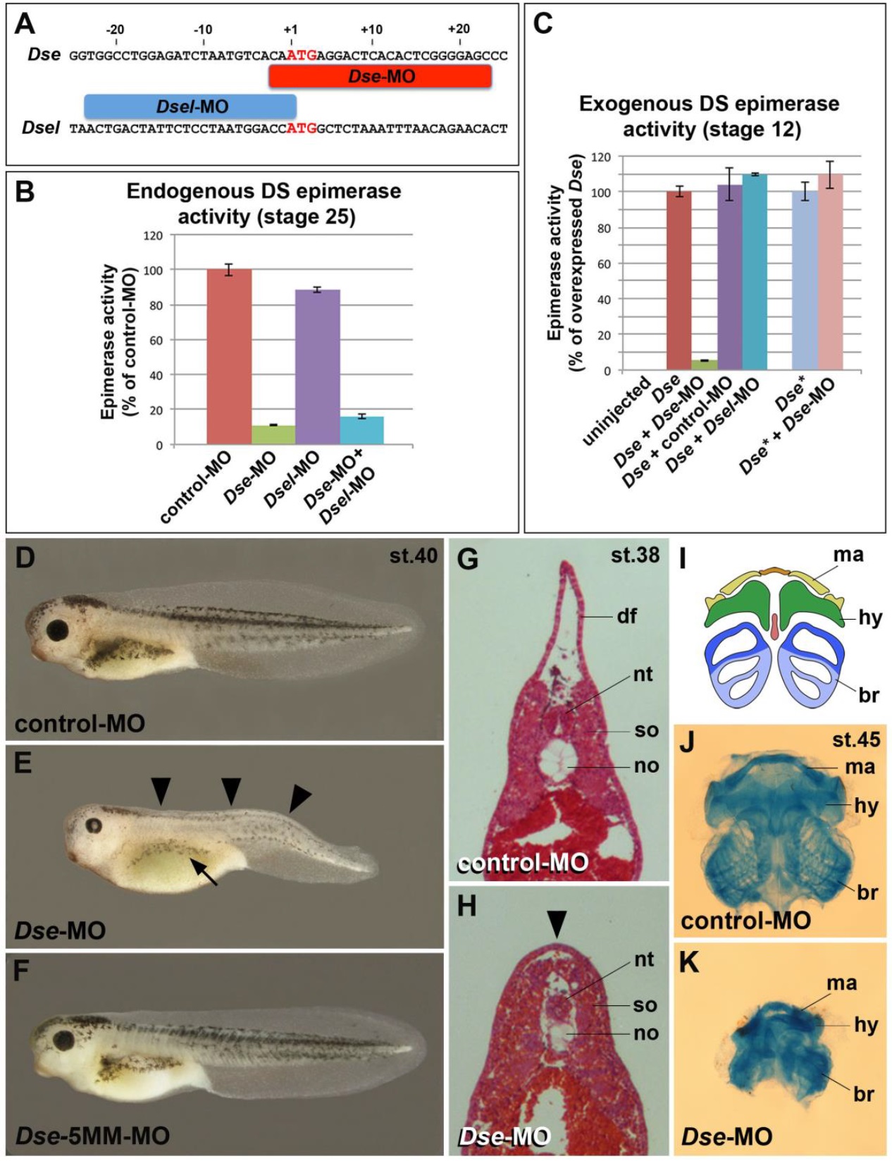 Fig. 2. Knockdown of DS-epi1 reduces DS epimerase activity and NC-derived structures. (A) Morpholino oligonucleotides target the translation initiation sites of Dse and Dsel. (B) Endogenous DS epimerase activity is substantially decreased by Dse-MO but only a little by Dsel-MO in stage 25 embryos. (C) Epimerase activity induced by the injection of 1â ng Dse mRNA is blocked by Dse-MO, but not by control-MO and Dsel-MO. The activity of 1â ng non-targeted Dse* mRNA is not affected by Dse-MO. Results in B and C are mean±s.d. (n=3). (D) Tadpole at stage 40 injected with control-MO. (E,F) Microinjection of Dse-MO, but not Dse-5MM-MO, induces small eyes, a lack of dorsal fin structures (arrowheads) and reduced melanocyte formation (arrow). (G,H) Transversal trunk sections of stage 38 embryos following hematoxylin and eosin staining. Note the lack of a dorsal fin (arrowhead), dorsally approaching somites and hypoplastic notochord in the Dse-morphant embryo. (I-K) Ventral view of head skeletons at stage 45 in a schematic overview (I) and following Alcian Blue staining (J,K). Injection of Dse-MO, but not control-MO, causes a reduction of NC-derived cartilage structures. br, branchial segment; hy, hyoid segment; df, dorsal fin; ma, mandibular segment; no, notochord; nt, neural tube; so, somite. The proportion of examined tadpoles or explants with the indicated phenotype was as follows: D, 70/70; E, 71/114 (microcephaly), 92/114 (reduced dorsal fin), 70/114 (less melanocytes); F, 63/63; G, 4/4; H, 4/4; J, 25/25; and K, 20/20. |