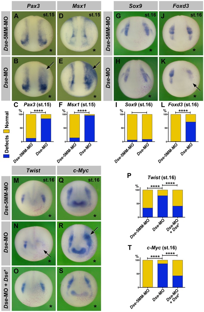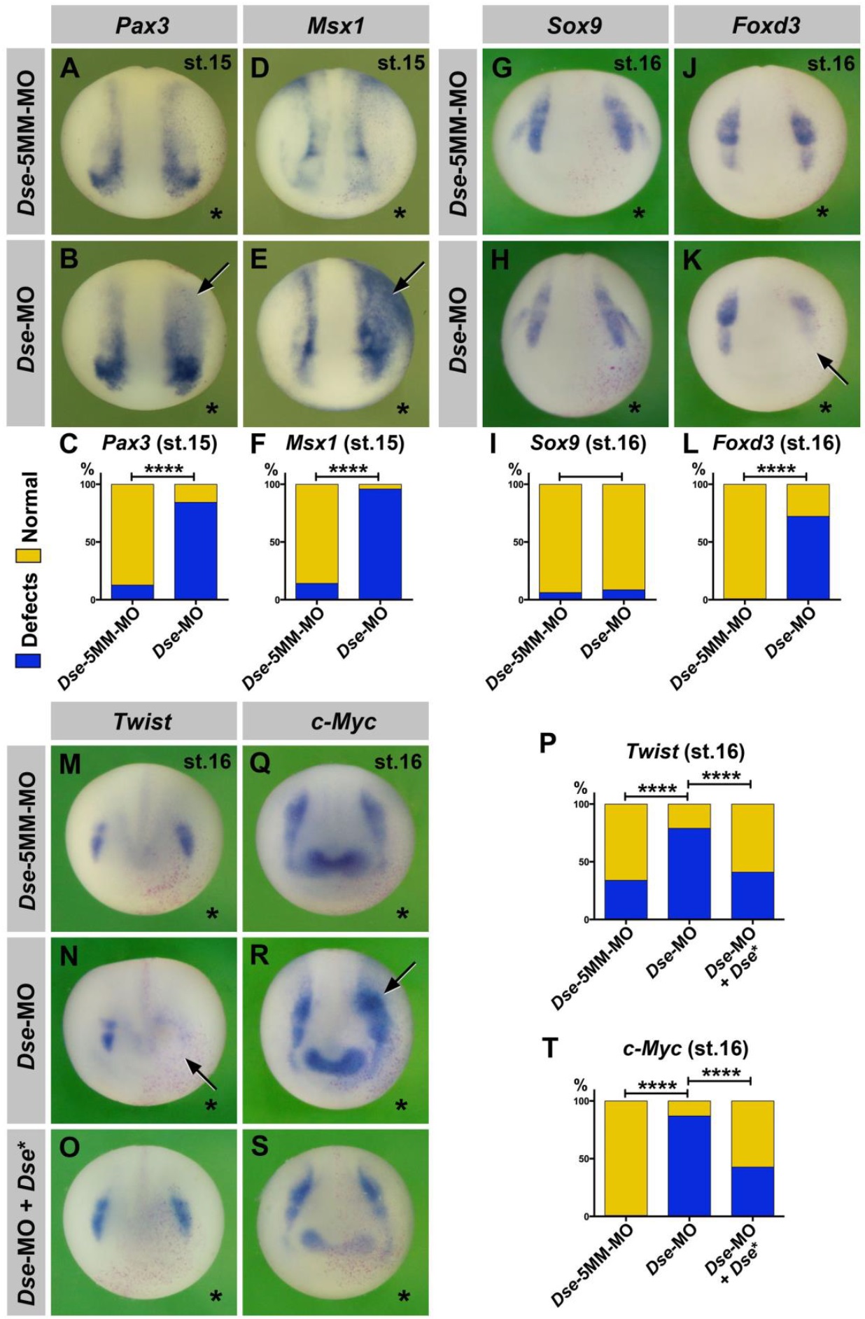 Fig. 4. DS-epi1 regulates gene markers of the neural plate border and CNC. Whole-mount in situ hybridization of early neurula embryos in an anterior view. The injected side is marked with a star. (A-F) A single injection of Dse-MO into embryos causes expansion of Pax3 and Msx1 expression at the neural plate border (arrows). The Dse-5MM-MO has no effect. A quantification of the percentage of embryos with defects is shown in C and F. (G-T) Dse-MO has no significant effect on Sox9; however, it triggers a reduction in Foxd3 and Twist expression, as well as an expansion of c-Myc expression (arrows). Normal Twist and c-Myc expression is restored by the co-injection of Dse-MO and 250â pg Dse* mRNA. nlacZ mRNA was injected as a lineage tracer (red nuclei). A quantification of the percentage of embryos with defects is shown in I, L, P and T. The proportion of examined embryos with the indicated phenotype was as follows: A, 37/42; B, 32/38; D, 26/30; E, 30/31; G, 35/37; H, 58/63; J, 30/30; K, 26/36; M, 13/20; N, 48/61; O, 16/27; Q, 90/90; R, 77/89; and S, 15/26. ****P<0.0001 (Fisher's exact test with two-tailed P-value calculation). |
