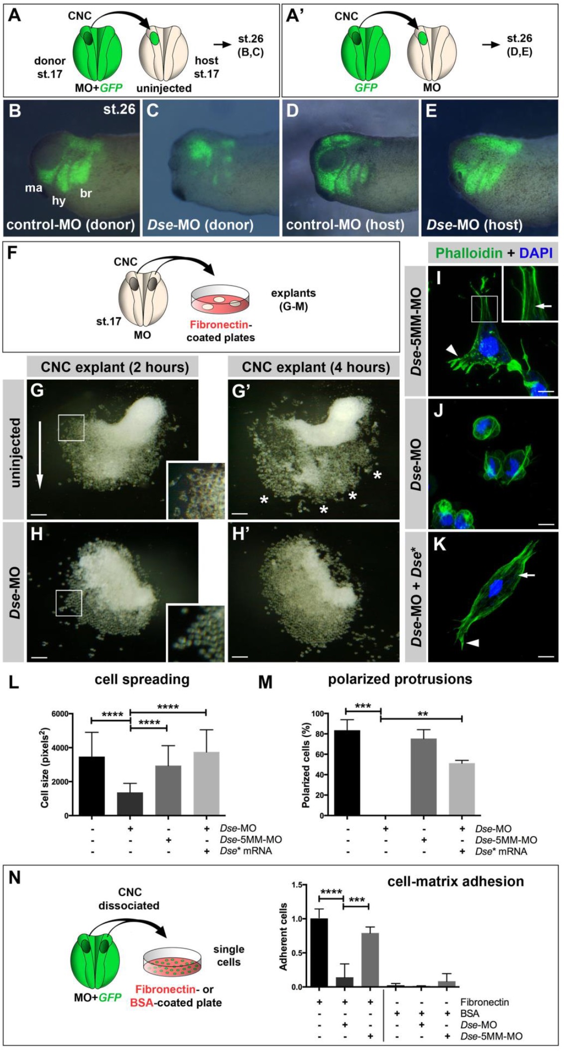 Figure 6. DS-epi1 has a tissue-autonomous role in cranial neural crest cell migration, adherence to fibronectin and cell polarization. (A,Aâ) Schemes for transplantation experiments. A CNC explant from an embryo injected with 300 pg GFP mRNA was homotypically grafted at stage 17. MOs were injected into the donor (A) or host embryo (Aâ). (B-E) Lateral view of embryos at stage 26. Grafted GFP+ CNC cells migrate ventrally when derived from control-MO- (B); however, they do not properly migrate when derived from Dse-MO-injected embryos (C). The CNC cell migration was normal when the host embryo was injected with control-MO or Dse-MO (D,E). Three independent experiments (n=3). (F) Scheme illustrating the culture of stage 17 morphant CNC explants on fibronectincoated plates.(G,Gâ) Two hours after plating (G), the control-MO-injected CNC explant exhibits collective cell migration in one direction (arrow). The inset shows a magnification of spread cells. After 4 hours (Gâ), the cells migrate in distinct streams (stars). (H,Hâ) Cells of Dse-MO-injected CNC explants detach from each other and fail to adhere to the fibronectin substrate. The inset depicts a magnification of the spherical cells. (I-K) Confocal microscopy of fixed CNC cells after 5 hours of explant culture on fibronectin. Phalloidin-488 and DAPI label F-actin and cell nuclei, respectively. The Dse-5MM-MO-injected control cell (I) exhibits lamellipodia at the leading edge (arrowhead) and stress fibers in the inner regions of the cell (arrow in inset). Dsemorphant cells (J) exhibit cortical networks of stress fibers and lack polarized protrusions. Co-injection of Dse-MO and 1 ng Dse* mRNA per embryo (K) restores the normal cytoskeleton and cell shape. (L,M) Quantification of cell spreading (L) and formation of polarized cell protrusions (M) in dissociated single, phalloidin-stained cells of CNC explants following 5 hours of culture on fibronectin. Cell spreading and polarized protrusions were quantified by calculating the cell size as the square number of pixels (ImageJ) and determining the percentage of cells with lamellipodia or filopodia, respectively. Uninjected and Dse- 5MM-MO-injected explants exhibit a similar extent of cell spreading and formation of polarized protrusions. The reduction in the cell size and the lack of lamellipodia and filopodia are rescued by the co-injection of Dse* mRNA in Dse-morphant explants. A minimum of 100 cells per sample were evaluated in each experiment. Number of independent experiments (n=3). (N) Cell-matrix adhesion of dissociated single CNC cells on fibronectin- or BSA coated plates. Following the co-injection of MO and 300 pg GFP mRNA, CNC explants from stage 17 embryos were dissociated in Ca2+/Mg2+-free medium and cultured for 45 min on fibronectin or BSA. The Dse-morphant cells exhibit decreased adhesion to fibronectin compared with the control and Dse-5MM-MO-injected cells. None of the analyzed cell samples exhibited significant cell adhesion to BSA. At least three independent experiments for each sample (n=3).BSA, bovine serum albumin. Indicated phenotypes are shown as follows: B, 10/12; C, 11/13; D, 7/7; E, 9/9; G, 30/34; H, 26/28. The scale is 100 um in G-Hâ and 10 um in I-K. Statistical significance was determined using ordinary one-way ANOVA multiple comparisons test with Tukey correction**, p<0.01, ***, p<0.001, ****, p<0.0001. |