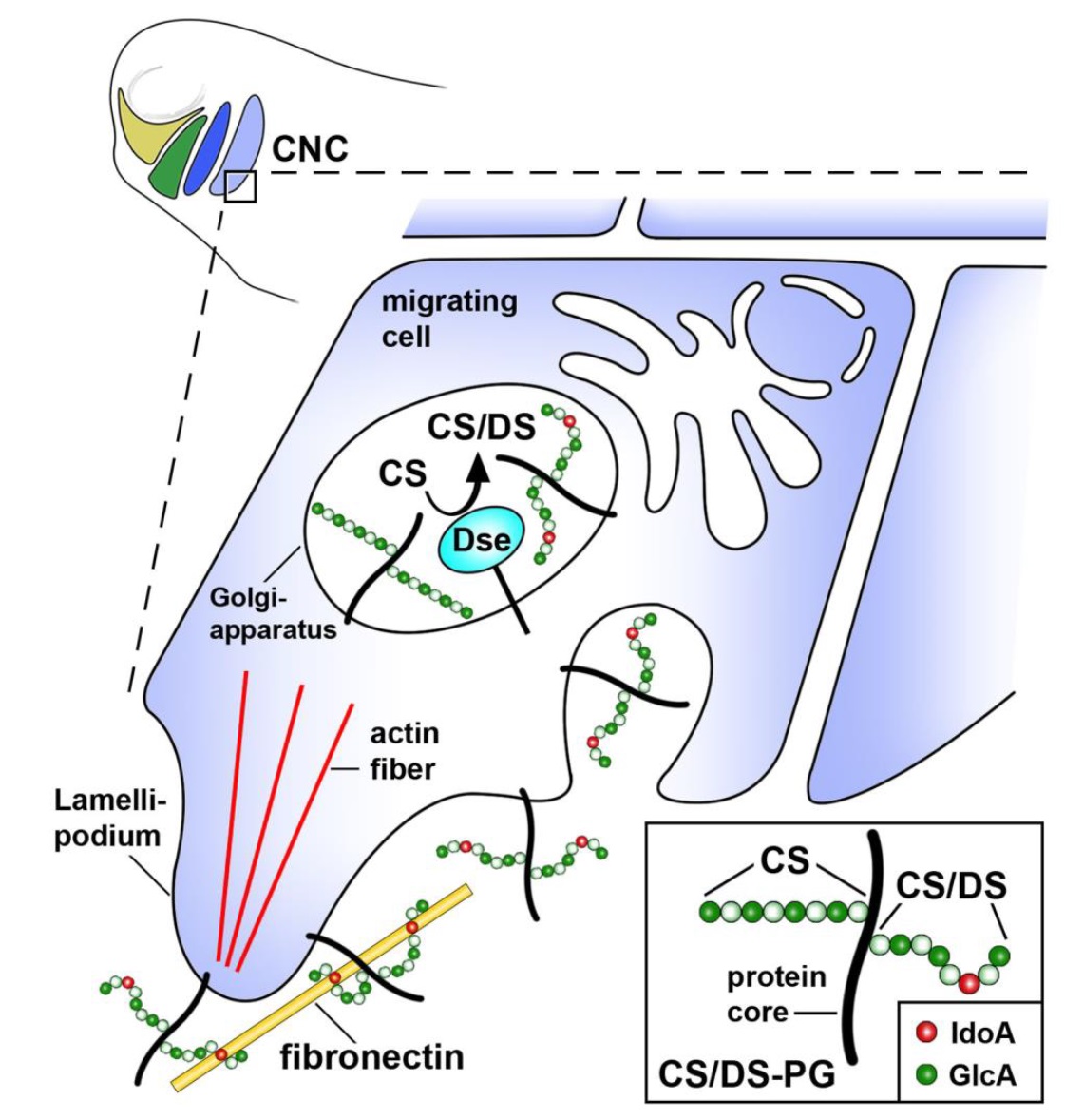 Figure 8. Model for the stimulation of cranial neural crest cell migration by chondroitin/dermatan sulfate proteoglycans in a post-neurula embryo. DS-epi1 converts GlcA into isolated IdoA residues on CS/DS-PGs. The interaction between CS/DS-PGs and extracellular fibronectin stimulates cytoskeletal rearrangement and polarized cell migration. CNC, cranial neural crest; CS, chondroitin sulfate; DS, dermatan sulfate; Dse, DS-epimerase 1; GlcA, glucuronic acid; IdoA, iduronic acid, PG, proteoglycan. |