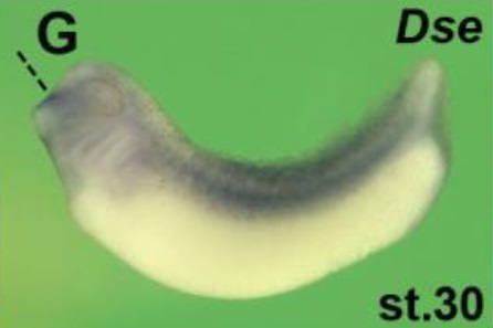 dse (dermatan sulfate epimerase) gene expression in Xenopus laevis embryo, assayed via in situ hybridization, NF stage 30, lateral view, anterior left, dorsal up. |
