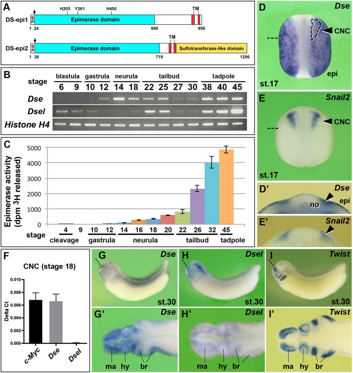 Fig. 1. Expression and activity of the two dermatan sulfate epimerases in Xenopus embryos. (A) Protein structures. Xenopus DS-epi1 and DS-epi2 contain cleavable signal peptides (SP, arrows), an epimerase domain and two transmembrane (TM) domains. In DS-epi1, the catalytic residues His205, Tyr261 and His450 are indicated, which are also conserved in DS-epi2. DS-epi2 contains an additional sulfotransferase-like domain. (B) RT-PCR analysis of Dse and Dsel. Histone H4 is used as the loading control. A minimum of two experiments (nâ¥2) was performed with three independent biological samples. (C) DS epimerase activity in early Xenopus embryos. Results are mean±s.d. from triplicates (two independent experiments). (D-Eâ²) Whole-mount in situ hybridization of neurula embryos in the dorsal view (D,E) and in transversal section (Dâ²,Eâ²). The arrowheads label the pre-migratory CNC cells. The region enclosed by the dashed line demarcates the Snail2+ CNC embedded in the Dse expression domain. (F) qPCR analysis in CNC explants at stage 18. c-Myc was used as a CNC cell marker. Note that Dse but not Dsel mRNA is detected. Results are mean±s.d. from triplicates (n=4 biological replicates). (G-Iâ²) Tailbud embryos in the lateral view (G-I) and horizontal section (Gâ²-Iâ²). Note that Dse and Dsel overlap with Twist expression in migrating CNC cells. Section planes are indicated with dashed straight lines. br, branchial arch segments; epi, epidermis; hy, hyoid segment; ma, mandibular segment; no, notochord. |