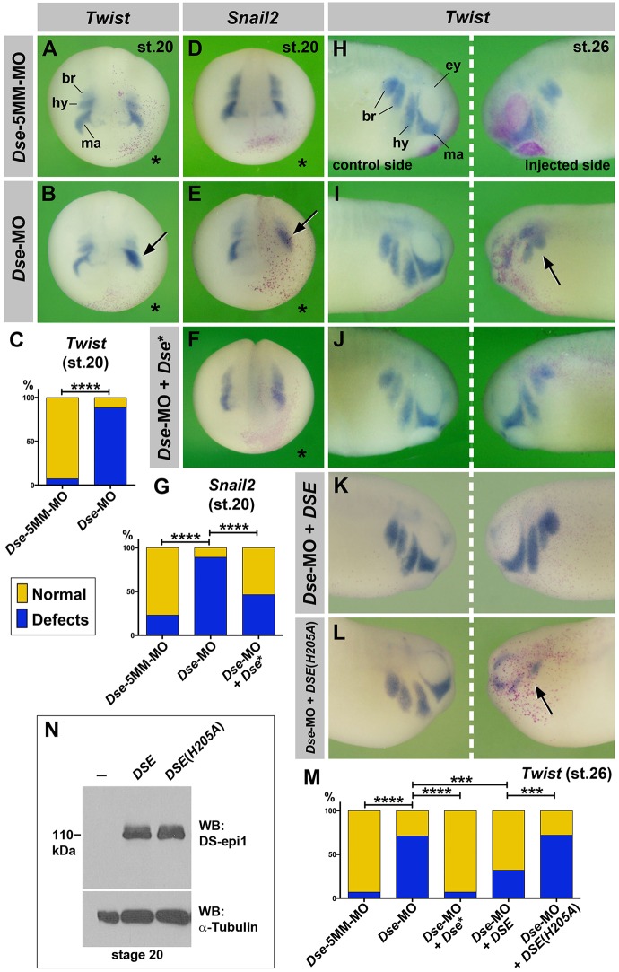 Fig. 5. DS-epi1 regulates CNC cell migration. (A-G) Anterior view of late neurula embryos. The injected side is marked with a star. Dse-MO impairs the segregation of Twist+ and Snail2+ CNC cells (arrows). The effect is reversed by 250â pg Dse* mRNA. A quantification of the percentage of embryos with defects is shown in C and G. (H-M) Lateral view of tailbud embryos. Dse-MO leads to defective migration of Twist+ CNC cells (arrow) on the injected side, which is rescued by the co-injection of 250â pg Dse* mRNA and 25â pg pcDNA3/CTAP-DSE plasmid, but not 25â pg pcDNA3/CTAP-DSE (H205A) plasmid DNA. A quantification of the percentage of embryos with defects is shown in M. (N) Western blot analysis of lysates from embryos injected with 100â pg pcDNA3/CTAP-DSE or pcDNA3/CTAP-DSE (H205A) plasmid DNA and probed for DS-epi1. α-tubulin is a loading control. br, branchial segment; ey, eye; hy, hyoid segment; ma, mandibular segment. The proportion of examined embryos with the indicated phenotype was as follows: A, 15/16; B, 30/34; D, 41/46; E, 50/65; F, 20/37; H, 25/27; I, 31/41; J, 36/44; K, 27/40; and L, 14/18. ***P<0.005; ****P<0.0001 (Fisher's exact test with two-tailed P-value calculation). |