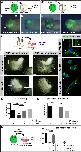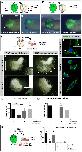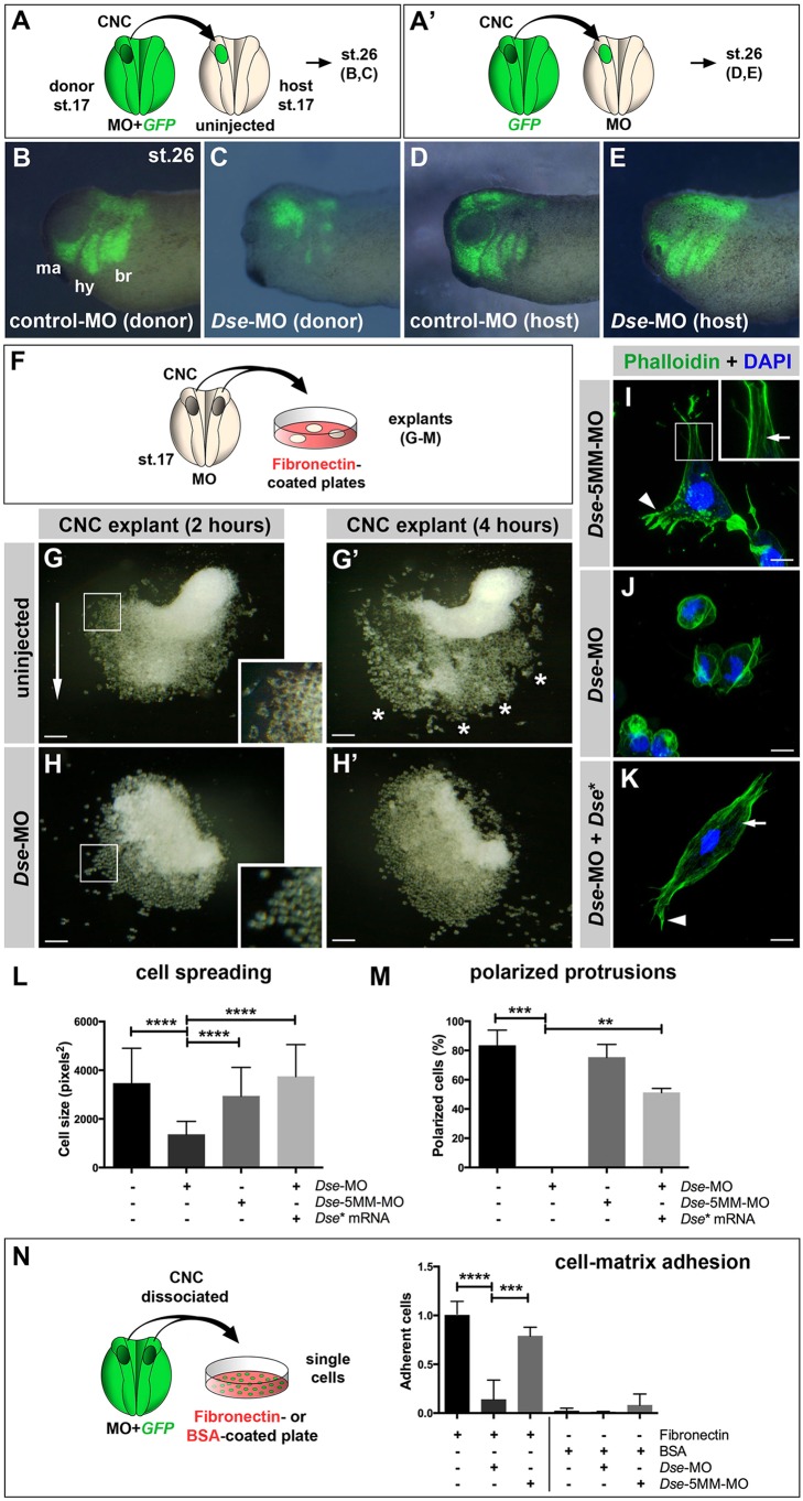Fig. 6. DS-epi1 has a tissue-autonomous role in CNC cell migration, adherence to fibronectin and cell polarization. (A,Aâ²) Schemes for transplantation experiments. A CNC explant from an embryo injected with 300â pg GFP mRNA was homotypically grafted at stage 17. MOs were injected into the donor (A) or host embryo (Aâ²). (B-E) Lateral view of embryos at stage 26. Grafted GFP+ CNC cells migrate ventrally when derived from control-MO-injected embryos (B); however, they do not properly migrate when derived from Dse-MO-injected embryos (C). br, branchial segment; hy, hyoid segment; ma, mandibular segment. The CNC cell migration was normal when the host embryo was injected with control-MO or Dse-MO (D,E). Three independent experiments were performed (n=3). (F) Scheme illustrating the culture of stage 17 morphant CNC explants on fibronectin-coated plates. (G,Gâ²) At 2 h after plating (G), the control-MO-injected CNC explant exhibits collective cell migration in one direction (arrow). The inset shows a magnification of spread cells. After 4â h (Gâ²), the cells migrate in distinct streams (asterisks). (H,Hâ²) Cells of Dse-MO-injected CNC explants detach from each other and fail to adhere to the fibronectin substrate. The inset depicts a magnification of the spherical cells. (I-K) Confocal microscopy of fixed CNC cells after 5â h of explant culture on fibronectin. PhalloidinâAlexa-Fluor-488 and DAPI label F-actin and cell nuclei, respectively. The Dse-5MM-MO-injected control cell (I) exhibits lamellipodia at the leading edge (arrowhead) and stress fibers in the inner regions of the cell (arrow in inset). Dse-morphant cells (J) exhibit cortical networks of stress fibers and lack polarized protrusions. Co-injection of Dse-MO and 1â ng Dse* mRNA per embryo (K) restores the normal cytoskeleton and cell shape. (L,M) Quantification of cell spreading (L) and formation of polarized cell protrusions (M) in dissociated phalloidin-stained single cells from CNC explants following 5â h of culture on fibronectin. Cell spreading and polarized protrusions were quantified by calculating the cell size as the square number of pixels (ImageJ) and determining the percentage of cells with lamellipodia or filopodia, respectively. Uninjected and Dse-5MM-MO-injected explants exhibit a similar extent of cell spreading and formation of polarized protrusions. The reduction in the cell size and the lack of lamellipodia and filopodia are rescued by the co-injection of Dse* mRNA in Dse-morphant explants. A minimum of 100 cells per sample were evaluated in each experiment. Number of independent experiments (nâ¥3). Results are mean±s.d. (N) Cellâmatrix adhesion of dissociated single CNC cells on fibronectin- or BSA-coated plates. Following the co-injection of MO and 300â pg GFP mRNA, CNC explants from stage 17 embryos were dissociated in Ca2+- and Mg2+-free medium and cultured for 45â min on fibronectin or BSA. The Dse-morphant cells exhibit decreased adhesion to fibronectin compared with the control and Dse-5MM-MO-injected cells. None of the analyzed cell samples exhibited significant cell adhesion to BSA. At least three independent experiments were performed for each sample (nâ¥3). Results are mean±s.d. The proportion of examined explants or cells with the indicated phenotype was as follows: B, 10/12; C, 11/13; D, 7/7; E, 9/9; G, 30/34; H, 26/28. Scale bars: 100â µm (G-Hâ²); 10â µm (I-K). **P<0.01, ***P<0.001, ****P<0.0001 (one-way ANOVA multiple comparisons test with Tukey correction). |
