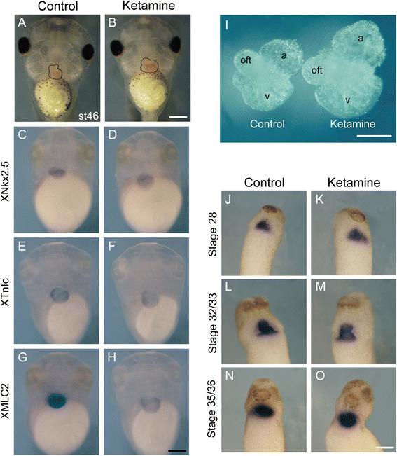 Fig. 2. The effect of ketamine on cardiac morphology. a-h Embryos at stage 46. a-b Live embryos. c-h Whole-mount RNA in situ hybridization (WMISH) analysis of the heart-specific gene XNkx2.5 and myocardium-specific genes XTnIc and XMLC2. i The dissected hearts from embryos at stage 46. oft, outflow tract; a, atria; v, ventricle. j-o WMISH analysis of XMLC2 at stage 28, 32/33 and 35/36. Scale barâ=â20 μm