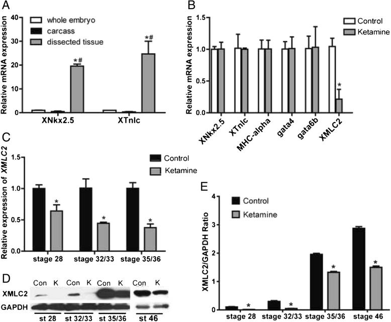 Fig. 5. The effect of ketamine on heart development-related gene expression. a The mRNA levels of heart-specific genes XNkx2.5 and XTnIc in whole embryos, carcasses and dissected tissues at stage 46. *Pâ<â0.05, #Pâ<â0.05. b The mRNA levels of heart development-related genes, XNkx2.5, XTnIc, MHC-alpha, gata4, gata6b and XMLC2 in dissected tissues at stage 46. *Pâ<â0.05. c XMLC2 mRNA levels at stage 28, 32/33 and 35/36. d XMLC2 protein levels at stage 28, 32/33, 35/36 and 46. e Quantitation of the levels of XMLC2 protein shown in D. The data are expressed as the meansâ±âSD. Con :control, K: ketamine, st: stage.