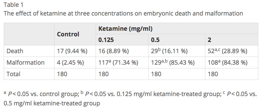 Table 1. The effect of ketamine at three concentrations on embryonic death and malformation.