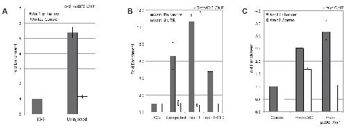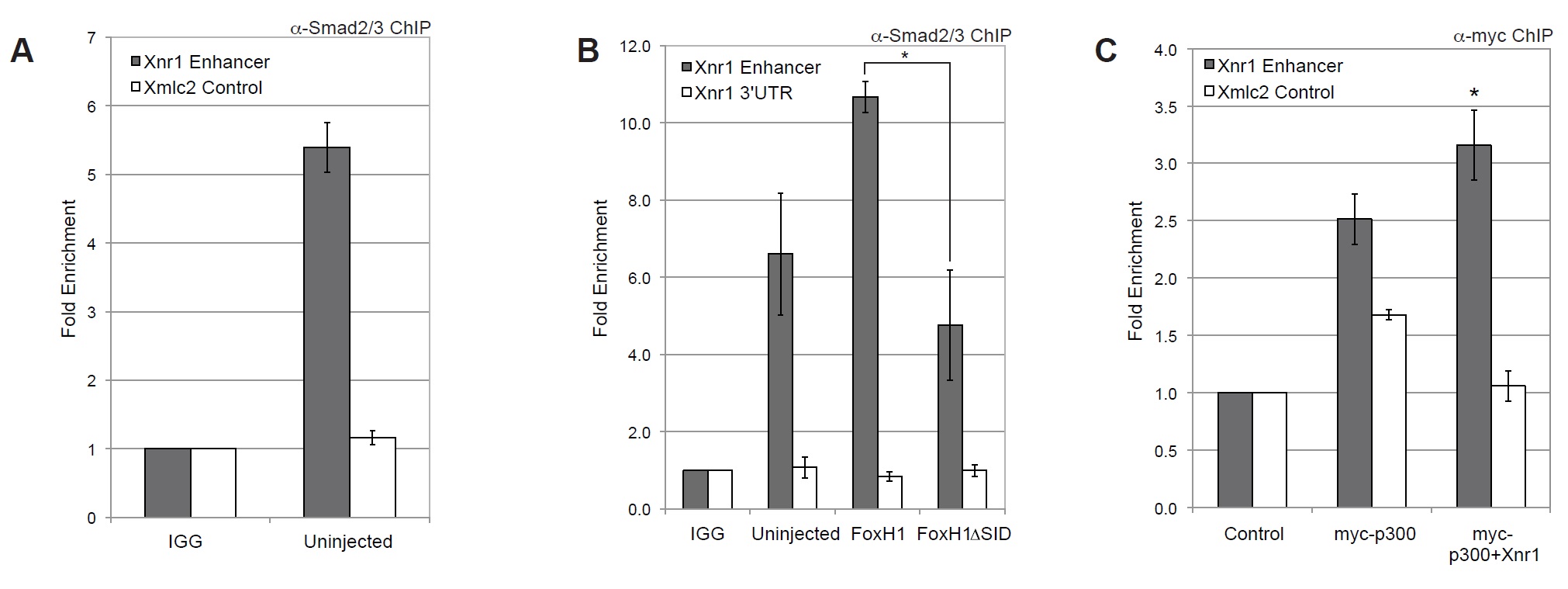 suppl Fig. 4: Smad2/3 occupies the endogenous Xnr1 enhancer in a FoxH1-dependent manner. (A) ChIP for endogenous Smad2/3 in uninjected embryos demonstrates Xnr1 enhancer enrichment (gray bars) without enrichment for the Xmlc2 enhancer (white bars). (B) ChIP for endogenous Smad2/3 in uninjected embryos or embryos injected with mRNA encoding FoxH1 or FoxH1âSID mRNA (250 pg) was evaluated by qPCR for the Xnr1 enhancer. The white bars represent qPCR for the Xnr1 3â²UTR control, which exhibits no interaction. The data presented represent three independent experiments. (C) ChIP for myc-p300 either alone or coexpressed with Xnr1 was evaluated by qPCR for the Xnr1 enhancer. The white bars represent qPCR for genomic Xmlc2 as a control. * indicates p<0.05 when compared to myc-p300 alone. The data represent four independent experiments. |