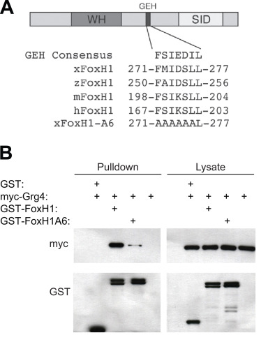 Fig. 1. FoxH1 contains a conserved EH1 motif that mediates a physical interaction with Grg4. (A) A diagram of the FoxH1 protein shows the location of the EH1 motif between the winged helix (WH) DNA binding domain and the Smad Interaction Domain (SID). This motif is highly conserved among multiple species (Xenopus, zebrafish, mouse and human). In the FoxH1A6 mutant, 6 of the 7 residues that comprise the EH1 motif have been mutated to alanine. (B) FoxH1 physically interacts with Grg4. mRNA encoding GST, GST-FoxH1 or GST-FoxH1A6 (1 ng) was injected along with myc-Grg4 mRNA (5 ng) into single cell embryos, which were collected at the gastrula stage for GST pulldown assays (Left). Top panel represents an anti-myc western blot, showing the physical interaction of myc-Grg4 with GST-FoxH1 (lane 3), which is reduced with mutation of the EH1 motif in FoxH1A6 (lane 4). Lower panel is an anti-GST western indicating recovery of GST proteins by pulldown. (Right) Control western blots showing approximately equal expression of myc-tagged and GST-tagged proteins in the starting lysates. |