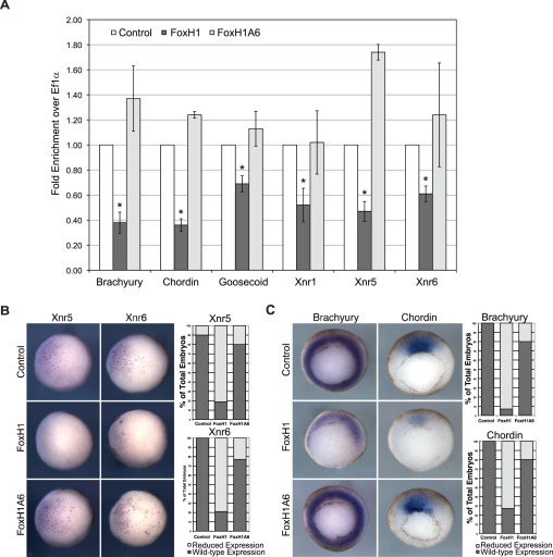 Fig. 2. FoxH1 represses Nodal target genes at blastula and gastrula stages. (A) FoxH1, but not FoxH1A6, represses expression of endogenous mesodermal and Nodal genes. Embryos were injected in the vegetal pole with mRNA encoding myc-FoxH1 or myc-FoxH1A6 (250 pg). cDNA was prepared from pooled whole embryos collected at blastula stage (for Xnr5 and Xnr6) and gastrula stage (for Xbra, Chd and Gsc). qPCR was performed for the mesodermal marker Brachyury, the organizer genes Chordin and Goosecoid, and the Nodal ligands Xnr1, Xnr5 and Xnr6. The data presented are the combined results of three independent biological replicates, and have been normalized to expression of a housekeeping gene, EF1α. Error bars represent standard error. * indicates p<0.05 by Student's t-test. (B) FoxH1, but not FoxH1A6, inhibits expression of Xnr5 and Xnr6 in the blastula vegetal pole. Embryos injected in the vegetal pole with mRNA encoding myc-FoxH1 or myc-FoxH1A6 (250 pg) were collected at the late blastula stage and subjected to in situ hybridization for either Xnr5 or Xnr6. (C) FoxH1, but not FoxH1A6, blocks expression of Xbra and Chd in the gastrula. Embryos were injected in the vegetal pole with mRNA encoding myc-FoxH1 or myc-FoxH1A6 (250 pg) and collected at the mid-gastrula stage. In situ hybridization was performed to analyze expression of Xbra and Chd. 100 embryos were analyzed for each condition, and the percentage of embryos displaying normal (dark gray bar) or reduced (light gray bar) expression was quantified in the bar graphs to the right. Expression of FoxH1 reduced the expression of Xnr5, Xnr6, Xbra and Chd. |