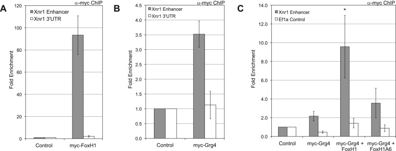 Fig. 4. Grg4 occupies the endogenous Xnr1 Enhancer through interaction with the FoxH1 EH1 motif. Occupancy at the Xnr1 enhancer was evaluated by chromatin immunoprecipitation (ChIP) and quantitative PCR (qPCR) of embryos injected with (A) 250 pg myc-FoxH1 or (B) 8 ng myc-Grg4. Immunoprecipitation using anti-myc antibody was also performed on uninjected embryos (Control). Each result shown represents three independent experiments. The white bars represent qPCR for genomic Xnr1 3â²UTR as a control. (C) Genomic DNA fragments recovered by ChIP from embryos injected with myc-Grg4 alone (8 ng) or in combination with untagged FoxH1 or FoxH1A6 (250 pg) were evaluated by qPCR for the Xnr1 Intron 1 enhancer (gray bars). The white bars represent qPCR for genomic Ef1α as a control. The data shown represent three independent biological replicates. * indicates that p<0.05 as compared to myc-Grg4 alone. |