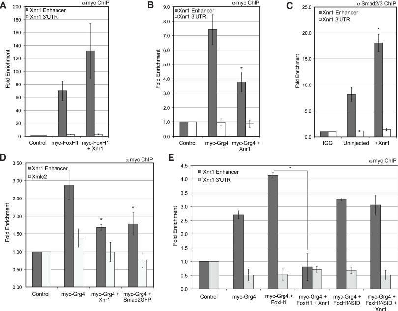 Fig. 5. Grg4 occupies the Xnr1 enhancer in a Nodal-responsive manner. (A) ChIP for myc-FoxH1 alone or coexpressed with Xnr1 (myc-FoxH1+Xnr1) or (B) ChIP for myc-Grg4 alone or coexpressed with Xnr1 (myc-Grg4+Xnr1) was evaluated by qPCR for enrichment of the Xnr1 enhancer. (C) ChIP for endogenous Smad2/3 in uninjected embryos or embryos expressing 50 pg Xnr1 mRNA (+Xnr1) was evaluated by qPCR for the Xnr1 enhancer. Rabbit IGG ChIP serves as a negative control (IGG). (D) ChIP for myc-Grg4 alone, or coexpressed with Xnr1 (myc-Grg4+Xnr1) or Smad2GFP mRNA (myc-Grg4+Smad2GFP) was evaluated by qPCR for the Xnr1 enhancer. (E) ChIP for myc-Grg4 expressed alone or in combination with the following: FoxH1 (myc-Grg4+FoxH1), FoxH1 and Xnr1 (myc-Grg4+FoxH1+Xnr1), FoxH1âSID (myc-Grg4+FoxH1âSID) or FoxH1âSID and Xnr1 (myc-Grg4+FoxH1âSID+Xnr1) were evaluated by qPCR for the Xnr1 enhancer. The data shown represent three independent biological replicates. Immunoprecipitation using anti-myc antibody was performed on uninjected embryos (Control). White bars represent qPCR for genomic Xmlc2 or genomic Xnr1 3â²UTR as additional negative controls. * indicates p<0.05. |