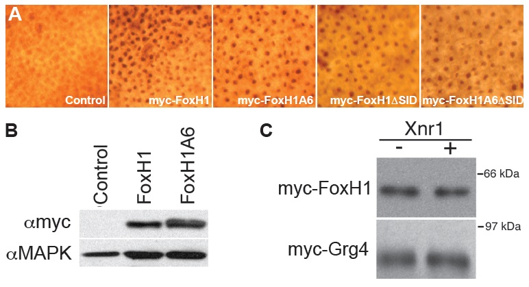 supp Fig. 1: Expression levels of tagged FoxH1 proteins. (A) Immunocytochemistry for myc-tagged FoxH1 proteins demonstrates equivalent expression and nuclear localization of wild-type and mutant proteins in Xenopus embryos (250 pg mRNA injection for each construct). (B) Western blot showing near equal expression of myc-FoxH1 and myc-FoxH1A6 protein expression in embryos injected with 250 pg mRNA. The equivalent of 0.5 embryo is loaded in each lane. MAPK expression serves as loading control. (C) Western blots for myc-FoxH1 or myc-Grg4 after chromatin immunoprecipitation from embryos. A 20 µl sample of the eluate from ChIP of myc-FoxH1 or myc-Grg4 was combined with Laemmli buffer and boiled 30 min at 95 °C. The resulting sample was subjected to Western blot analysis using 9E10 antibody. The Western approximates 10% of the total immunoprecipitate. |