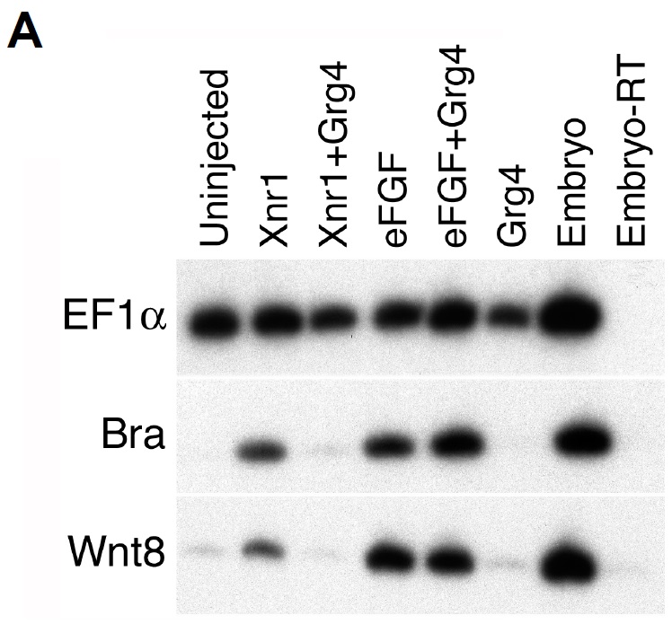 Suppl Fig. 2: Grg4 specifically blocks Nodal-dependent mesoderm induction. (A) One-cell stage embryos were injected in the animal pole with mRNAs encoding Xnr1 (30 pg), eFGF (400 pg), myc-Grg4 (5 ng) or the combinations indicated. RT-PCR was performed on animal explants prepared at blastula stage and collected at gastrula stage. Expression of mesodermal genes Xbra and Xwnt8 is shown, with Ef1α as a positive control. |