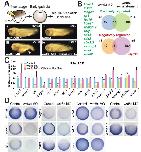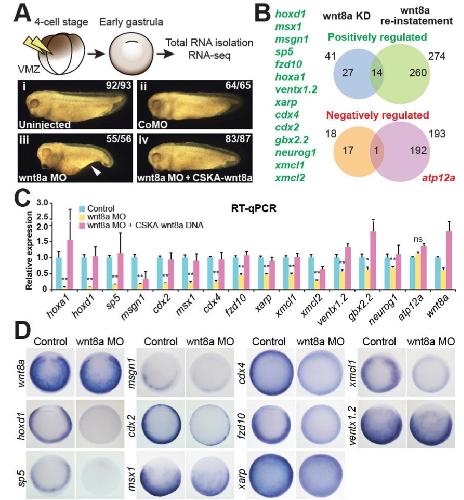 Fig. 2. RNA-seq analysis to identify wnt8a-regulated genes. (A) Experimental design to identify wnt8a-regulated genes. wnt8a MO and standard control MO (CoMO) were microinjected into the ventral marginal zone (VMZ) of four-cell stage embryos (prospective endogenous wnt8a-expressing and ventral mesoderm tissue). For the re-instatement experiment, wnt8a MO was co-injected together with a DNA construct driving exogenous Wnt8a (CSKA-wnt8a) in the same tissue. Eventually three biological replicates per experimental sample were sequenced. The experimental conditions were optimized by comparing the morphology of uninjected (i), CoMO-injected (ii), wnt8a MO-injected (iii) and wnt8a MO- and CSKA-wnt8a DNA co-injected embryos (iv), as well as expected changes to expression of candidate genes (Fig. S2). (B) Venn diagrams of genes that are positively (top) or negatively (bottom) regulated by wnt8a signalling identified by Generalized Linear Model (GLM) statistical analysis (FDR < 0.1, see the supplementary materials and methods) of RNA-seq results. 41 genes were identified with reduced expression in the wnt8a knockdown (blue, compared to uninjected and CoMO-injected controls) and 274 genes with increased expression when Wnt8a expression was re-instated (green, compared to wnt8a knockdown). A shortlist of 14 positively wnt8a-regulated genes (listed on the left) was selected for further analysis by the overlap between these two groups of genes (see Table S2 for full gene lists). 18 genes with increased expression were identified in the wnt8a knockdown (amber) and 193 genes with reduced expression when Wnt8a expression was reinstated (purple) with one gene (atp12a) in the overlap, therefore apparently negatively regulated by wnt8a. (C) Validation of RNA-seq-discovered candidate genes by RT-qPCR. Transcripts collected from embryos microinjected into all four blastomeres with wnt8a MO (yellow bars) and wnt8a MO co- injected with CSKA-wnt8a DNA (pink bars) were compared to control (CoMO-injected, blue). All 14 positively wnt8a-regulated candidate genes of the shortlist were confirmed; but not atp12a, which had been suggested to be negatively regulated. Note varying extent of dependence on wnt8a function in different genes. *p < 0.1; **p < 0.05; ns, not significant (p ⥠0.1)(two-tailed Studentâs t-test). Error bars represent s.d. of two biological replicates. (D) Vegetal view of early gastrulae (with dorsal up) of control- (uninjected) and wnt8a MO- injected embryos. Note expression of wnt8a-regulated genes in similar but not always identical pattern as wnt8a. Also note reduced expression to varying extent in wnt8a MO- injected embryos. |