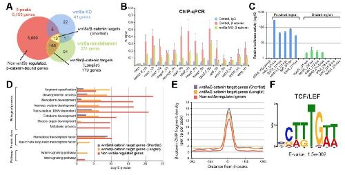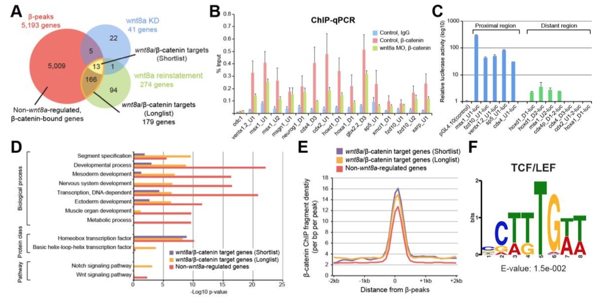 Fig. 3. Integrating β-catenin ChIP-seq and RNA-seq analysis to identify direct wnt8a/β- catenin target genes. (A) Venn diagram illustrating overlap between genes near β-peaks (red disc) and the positively wnt8a-regulated genes (as in Fig. 2B). Note that from among the longlist of 274 potential wnt8a-regulated genes, 179 are associated with identified β-peaks (amber border around lens-shaped area), representing the longlist of probable direct wnt8a/β-catenin target genes. Also note that all but one (xmcl2) of the validated shortlist of positively wnt8a-regulated genes are among those and therefore represent the short list of 13 direct wnt8a/β-catenin target genes (yellow). Also note that the majority of gene loci near β-peaks are not correlated with wnt8a-regulated genes and conversely, that more than a third of wnt8a-regulated genes in our longlist are not associated with identified β-peaks (most likely representing indirect wnt8a target genes). (B) β-catenin ChIP-qPCR of identified β-peaks of our shortlist in chromatin extracted from control (uninjected) and wnt8a MO- injected embryos. Note β-catenin association is reduced in wnt8a loss-of-function experiment in most of the analysed 15 identified β-peaks (IgG antibodies were used as control; error bars represent s.e.m. of three to five biological replicates). (C) Luciferase assays of reporter constructs containing sequences near identified β-peaks of wnt8a-regulated genes. Error bars represent s.d. of three biological replicates. (D) Gene Ontology analysis suggests that β-peak-associated genes tend to encode predominantly transcription factors and also cell-to- cell signalling components, and to function in developmental processes; with different emphasis between wnt8a-regulated (amber) and non-regulated genes (red). (E) DNA occupancy level of β-catenin around the peak summit shows higher enrichment in direct wnt8a/β-catenin target gene loci (purple: shortlist, amber: longlist) compared to non-wnt8a- regulated genes (red). Read density was analysed using HOMER (bin size 100 bp). (F) TCF/LEF consensus motif is enriched under all 58 β-peaks associated with all 13 shortlisted wnt8a/β-catenin target genes. |