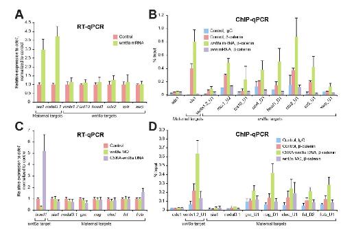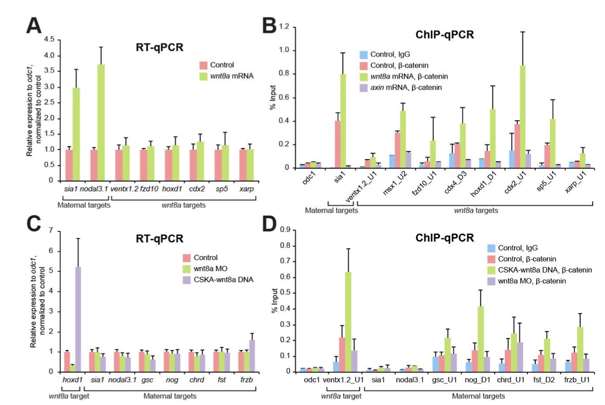 Fig. 4. β-catenin recruitment is not sufficient for transcriptional regulation. (A,B) Maternally activated Wnt/β-catenin signalling regulates transcription of only context-specific maternal Wnt/β-catenin target genes. Experimental enhancement of maternal Wnt signalling, by injection of Wnt8a mRNA at the two- to four-cell stage, increases expression of maternal Wnt targets sia1 and nodal3.1 when analysed at the MBT compared to uninjected control (A). In contrast, expression levels of wnt8a target genes remain unchanged. However, β-catenin binding increases at both maternal Wnt target and zygotic wnt8a-regulated target loci at the 1000-cell stage (B). Note reduction of β-catenin binding following injection of axin mRNA indicates that maternally regulated endogenous β-catenin associates with not only maternal Wnt target genes but also zygotic wnt8a target genes. (C,D) Zygotically activated β-catenin controls expression of only zygotic wnt8a targets. wnt8a MO or CSKA-wnt8a DNA were injected at the two- to four-cell stage and gene expression and β-catenin binding were analysed at the early gastrula stage. Knockdown of wnt8a reduces and zygotic activation of Wnt8a signalling increases expression of the wnt8a target hoxd1, as a control. While the wnt8a knockdown or overexpression does not affect expression of maternal Wnt-regulated genes (C), over-activation of Wnt8a signalling increases β-catenin binding to some maternal Wnt-regulated loci (D) but not to the well-characterized direct maternal Wnt target genes sia1 and nodal3.1. Error bars represent s.d. and s.e.m. of three biological replicates for RT-qPCR and ChIP-qPCR, respectively. |