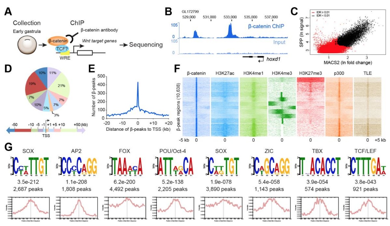 Fig. 1. β-catenin ChIP-seq analysis of early gastrulae. (A) Experimental design of β-catenin ChIP-seq analysis. Early gastrulae were collected and fixed. Following chromatin shearing, β-catenin antibodies were used to selectively precipitate DNA fragments bound by β-catenin- containing protein complexes. Subsequently, the precipitated DNA fragments were sequenced. (B) Genome view of example β-catenin-target gene hoxd1. Note clear β-catenin ChIP-seq peaks (β-peaks) downstream (to the left) of the hoxd1 locus. (C) Scatter plot combining peak calling analysis by SPP (considering signal strength, applying False Discovery Rate (FDR) ⤠0.1) and MACS2 (considering fold change, applying p ⤠0.01) software, with black dots indicating 10,638 β-peaks reproducibly called (applying an Irreproducible Discovery Rate (IDR) ⤠0.01). (D,E) β-peaks are associated with sequences throughout the genome (D) but enriched close to and just upstream (putative promoter) of the transcription start site (TSS) of nearby genes (E, analysed in 500 bp bins). Pie chart (in D) showing percentage of β-peak according to their location relative to TSS (within 1 kb, 1-5 kb, 5-10 kb, 10-50 kb, over 50 kb upstream or downstream of TSS as indicated by the colour code). (F) Heatmap illustrating genome-wide association of β-peaks with histone modifications and transcription co-factor-binding sites indicative of cis-regulatory modules (CRMs, such as promoters and enhancers) in patterns that can be clustered into ten groups. Each horizontal line represents the 5 kb downstream and upstream region of ChIP-seq data around a β-peak. (G) Enriched motifs from de novo motif search of sequences under β-peaks. Note identification of consensus TCF/LEF-binding but also other known transcription factor- binding motifs. Statistical significance (e-values) and the number of β-peaks are indicated below each motif logo. The analysis of motif distribution shows central enrichment of motifs within β-peak regions (500 bp window). |