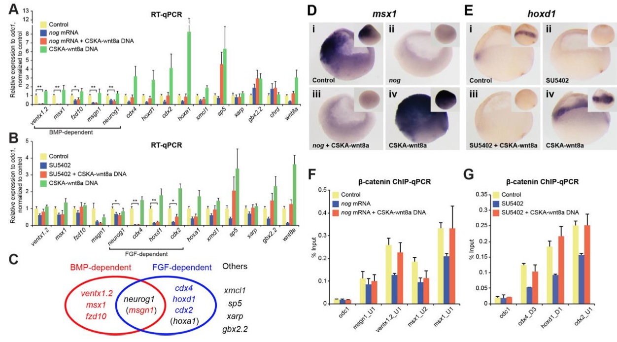 Fig. 5. BMP or FGF signalling is required for wnt8a target gene expression but not for β-catenin recruitment. (A) BMP signalling is required for context-specific transcriptional regulation by wnt8a signalling, but only of some wnt8a target genes. Two- to four-cell stage embryos were injected with BMP antagonist noggin (nog) mRNA. CSKA-wnt8a DNA was injected additionally to reinstate Wnt8a expression (as endogenous wnt8a expression is itself regulated by BMP signalling). Expression was analysed by RT-qPCR at the early gastrula stage. When BMP signalling is blocked, expression of BMP-dependent genes remains reduced even when Wnt8a expression is reinstated. (B) FGF signalling is required for context-specific transcriptional regulation by wnt8a signalling, but only of some wnt8a target genes. Embryos were treated with FGFR inhibitor SU5402 from the 1,000/2,000-cell stage through the early gastrula and injected where indicated with CSKA-wnt8a DNA at the two- to four-cell stages (to reinstate Wnt8a expression as endogenous wnt8a expression is itself regulated by FGF signalling). When FGF signalling is inhibited, expression of FGF- dependent genes remains reduced, even when Wnt8a expression is reinstated. (C) wnt8a target genes can therefore be classified into BMP- or FGF-dependent genes. Note some genes belong to both groups and others are neither BMP- nor FGF-dependent. (D,E) in situ hybridisation shows expression of msx1 (D) and hoxd1 (E) in cross-sections and lateral views (small images) of control uninjected and experimentally manipulated embryos as indicated, with dorsal right. (F) BMP signalling is not required for wnt8a-regulated β-catenin recruitment to BMP-dependent wnt8a target gene loci. Embryos were treated as in A and analysed with β-catenin ChIP-qPCR at the early gastrula stage. (G) FGF signalling is not essential for wnt8a-regulated β-catenin recruitment to FGF-dependent wnt8a target gene loci. Embryos were treated as in B and analysed with β-catenin ChIP-qPCR at the early gastrula stage. Uninjected, untreated embryos were used as controls in A,B, and D-G. *p < 0.1; **p < 0.05 with two-tailed Studentâs t-test. Error bars represent s.d. of four biological replicates (in A,B) or s.e.m. of three biological replicates (in F,G). Note that wnt8a gene expression was decreased by BMP or FGF pathway inhibition (wnt8a in blue bars in A,B) but restored by coinjection of CSKA-wnt8a DNA (wnt8a in orange bars in A,B) compared to controls (wnt8a in yellow bars in A,B) and that higher wnt8a expression levels in green bars reflect both expression of endogenous wnt8a and expression from CSKA-wnt8a DNA, resulting in upregulation of several wnt8a target genes (in A,B). |
