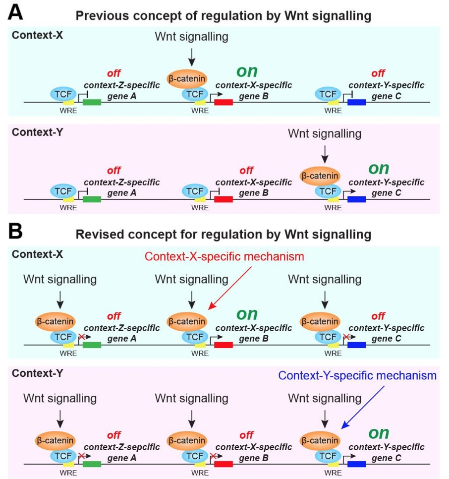 Fig. 6. Model for context-specific Wnt/β-catenin target gene regulation. (A) In previous concept established from studies of individual genes, Wnt signalling specifically controls β-catenin recruitment to the Wnt-response element (WRE) of context-specific target genes and leads to their transcription (e.g. gene B in the context-X). (B) In the revised concept from our studies, Wnt-regulated β-catenin recruitment takes place at numerous loci. Transcriptional activation at those loci is conditional on context-specific mechanisms (e.g. context-X-specific mechanism for gene B in the context-X). |