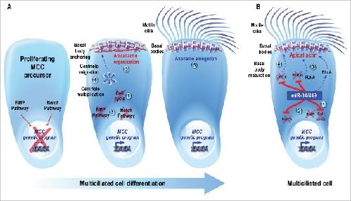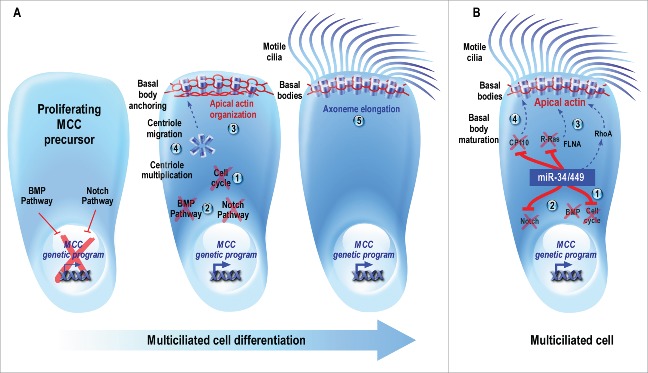 Figure 1. (A) Schematic description of multiciliogenesis. Proliferating MCC precursors must undergo (1) cell cycle exit followed by (2) the inhibition of BMP and Notch pathways, 2 early events required for the entry into MCC differentiation. (3) In maturing MCCs, the apical actin cytoskeleton is reorganized into a dense cortical meshwork. (4) In addition, a massive multiplication of centrioles occurs, followed by their migration toward the apical membrane, where they mature and anchor to the actin meshwork to form ciliary organizing centers known as basal bodies. (5) Finally, MCC maturation is achieved through the elongation of axonemes from basal bodies to form multiple motile cilia. These motile cilia subsequently orient and beat in a coordinated manner to generate robust directional fluid flow at the surface of the epithelium. (B) Model illustrating the conserved roles of miR-34/449 during vertebrate MCC differentiation. The specific expression of miR-34/449 in immature MCCs allows (1) the exit from the cell cycle and (2) the entry into differentiation through the direct repression of the Notch pathway. As a result, the MCC genetic program is triggered. As miR-34/449 expression is itself repressed by the activation of the Notch signaling, these miRNAs accumulate in maturing MCCs, thus maintaining a double negative feedback loop. Then, miR-34/449 can regulate subsequent steps such as (3) the reorganization of the apical actin network, by directly repressing R-Ras, modulating the RhoA activity, and allowing the apical relocalization of FLNA, and (4) basal body maturation by directly repressing CP110. Plain lines indicate direct interactions; dotted lines identify pathways that may or may not be direct.