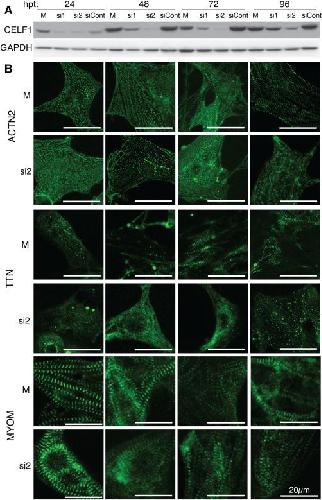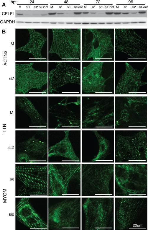Figure 3. CELF1 is required for myofibril assembly and maintenance. A: Western blot analysis shows that knockdown of CELF1 protein is detectable by 24 hr posttransfection (hpt) and persists through 96 hpt. Protein integrity and equivalent loading were confirmed by Ponceau S staining (not shown) and reprobing for GAPDH. B: Myofibrillar organization was monitored by immunofluorescence using sarcomeric markers (ACTN2, TTN, and MYOM) over 96 hr following mock (M) or siRNA (si2) transfection. Cells were transfected at 24 hr postplating and fixed at 24, 48, 72, and 96 hr posttransfection; panels match the time points indicated in (A). |