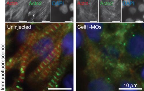 CUG-BP, Elav-like family member 1 (CELF1) is required for normal myofibrillogenesis, morphogenesis, and contractile function in the embryonic heart.