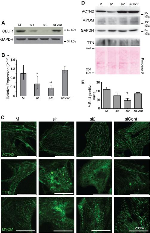 Figure 2. Knockdown of CELF1 leads to disorganization of myofibrillar structure and reduced proliferation in primary embryonic cardiomyocytes. A: Depletion of CELF1 with two independent siRNAs (si1 and si2) but not a control siRNA (siCont) is seen by Western blot at 72 hr posttransfection; M, mock transfection. Equivalent loading was confirmed by reprobing for GAPDH. B: Transfection of cells with si1 and si2, but not siCont, resulted in robust knockdown of CELF1 transcripts as measured by real-time RT-PCR. Values shown are means ± 95% confidence intervals. *P ⤠0.05; **P ⤠0.01 vs. mock-transfected cardiomyocytes as evaluated by Student's t-test. C: Knockdown of CELF1 at 24 hr postplating leads to disruption of myofibril organization as visualized by ACTN2, TTN, and MYOM immunofluorescence at 72 hr posttransfection. D: Western blots for ACTN2, TTN, and MYOM protein were performed on mock-, si1-, si2-, and siCont-transfected cardiomyocytes at 72 hr posttransfection. Protein integrity, equivalent loading, and successful transfer were confirmed by reprobing for GAPDH or Ponceau S staining. E: Proliferation was measured at 48 hr posttransfection by EdU incorporation. Values shown are means + standard errors of the mean. *P ⤠0.05 vs. siCont as evaluated by Student's t-test. |