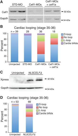 Figure 6. Morpholino-mediated knockdown of Celf1 can be ameliorated by restoration of Celf1 expression, and mimicked by repression of nuclear Celf activity. Xenopus laevis embryos were injected either with morpholino oligonucleotides (STD-MO, control morpholino; Celf1-MOs, a mix of two celf1-targeting morpholinos) ± celf1a RNA (A,B), or with RNA encoding a dominant negative CELF protein (NLSCELFδ; C, D) at the two- to four-cell stage and compared with uninjected controls at stage 35â36. A: Celf1 protein levels were determined by Western blotting. Two embryos per group are shown. Lanes shown are from the same blot. B: Cardiac looping and the incidence of cardia bifida following knockdown and restoration of Celf1 were evaluated by whole-mount immunohistochemistry using antibodies against meromyosin (MF20) or Tnnt2 (CT3). C: Dominant negative protein expression was confirmed at stage 26 by Western blotting for its Xpress epitope tag. Two embryos per group are shown. D: Cardiac looping and fusion defects were evaluated in embryos expressing the dominant negative CELF protein by whole-mount immunohistochemistry against meromyosin. D-loop, dextro-loop; L-loop, levo-loop. |