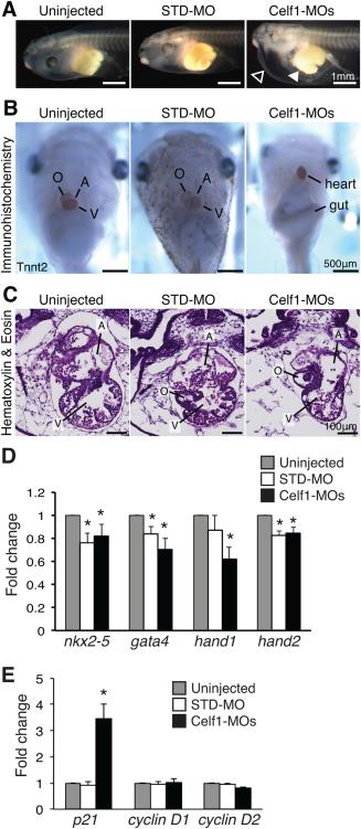 Figure 7. Morpholino-mediated knockdown of Celf1 in Xenopus laevis leads to ventral edema, gut malformation, and cardiac dysmorphia at stage 46. Embryos were injected with morpholino oligonucleotides at the two- to four-cell stage and evaluated at stage 46 (STD-MO, control morpholino; Celf1-MOs, a mix of celf1a- and celf1b-targeting morpholinos). A: Following depletion of Celf1, most Celf1-MOs-injected embryos exhibited ventral edema (open arrowhead) and many had a malformed gut (filled arrowhead). B: In embryos stained for Tnnt2, both cardiac and gut dysmorphia can be seen, as well as the aberrant orientation of the heart within the Celf1-MOs-injected embryos. C: The heart was evaluated by hematoxylin and eosin staining of frontal sections. Serial sections from five embryos per group taken from three separate injection sets were evaluated with similar results. Sections were chosen for similar planes through the heart, because both gross morphology and heart orientation were abnormal in Celf1-MOs-injected embryos. A, atrium; O, outflow tract; V, ventricle. D,E: Real-time RT-PCR was performed on RNA from hearts isolated at stage 46 for several cardiac transcription factors (D) and cell cycle genes (E) following Celf1 knockdown (n = 6â7). Error bars indicate standard error of the mean. *P ⤠0.05; vs. uninjected; Student's t-test. |