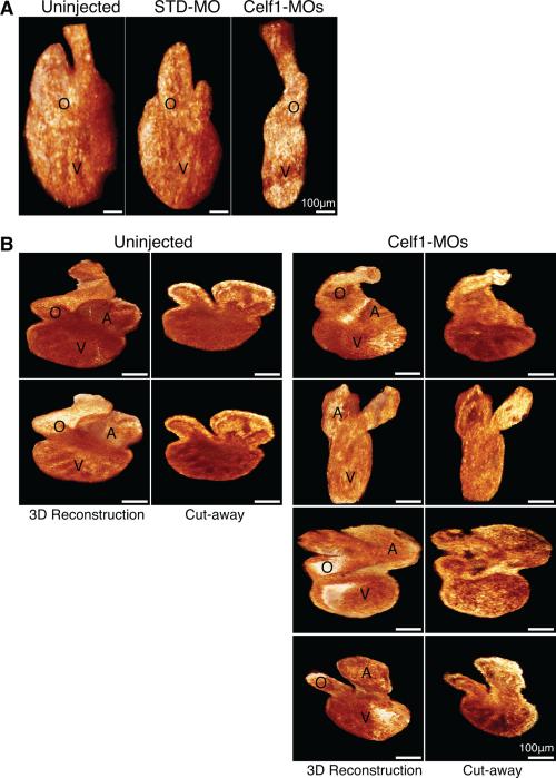Figure 8. Cardiac dysmorphia following morpholino-mediated knockdown of Celf1 in Xenopus laevis was imaged in situ and ex vivo at stage 46. The hearts of uninjected (n = 9), STD-MO-injected (n = 7), and Celf1-MOs-injected (n = 8) embryos at stage 46 were imaged in situ by optical coherence tomography (OCT), and then removed and imaged by optical coherence microscopy (OCM). A: Representative examples of three-dimensional reconstructions of OCT sections through the hearts are shown. General dysmorphia of the heart and outflow tract can be seen following Celf1 depletion; the atria cannot be resolved in these reconstructions. B: Representative examples of hearts imaged ex vivo using OCM, in intact three-dimensional reconstructions (left) and in cut-away views (right). Multiple hearts from Celf1-MOs-injected embryos are presented to demonstrate the range of dysmorphia observed. Heart reconstructions are shown at equivalent orientations for the purpose of comparison; this orientation does not necessarily match the orientation of the hearts in situ. A, atrium; O, outflow tract; V, ventricle. |
