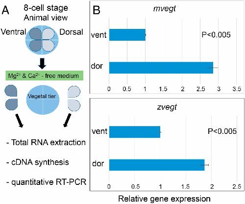 Fig. 5. Dorsoventral relocalization of vegt mRNA in animal blastomeres of eight-cell stage embryos (st 4) of X. laevis. (A) Outline of the methods. (B) Quantitation of mvegt and zvegt expression by RT-qPCR in animal blastomeres, normalized by the expression of histone H4. The data show the results of three independent experiments. dor, dorsal; P, statistics P value; vent, ventral.