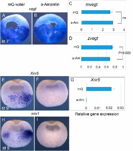 Fig. 6. Effect of α-amanitin on the expression of vegt, mix1, and Xnr5 mRNA in X. laevis embryos. milliQ-water or α-amanitin (100 pg per cell) were injected into each blastomere at the two-cell stage followed by in situ hybridization of hemibisected embryos or by RT-qPCR at the indicated stages. (A, E, and H) In situ hybridization of embryos treated with milliQ-water. (B, F, and I) In situ hybridization of embryos treated with α-amanitin. (C, D, and G) Relative gene expressions of mvegt, zvegt, and Xnr5 detected by RT-qPCR normalized by histone H4 expression. (AâD) vegt mRNA expression of st-7 embryos. (A and B) vegt mRNA in situ hybridization. (C) mvegt relative gene expression. (D) zvegt relative gene expression. (EâG) Xnr5 mRNA expression in st-9 embryos. (E and F) Xnr5 mRNA in situ hybridization. (G) Xnr5 relative gene expression. (H and I) mix1 mRNA expression of st-9 embryos detected by in situ hybridization. The data show the results of three independent experiments. Black arrowheads in A and B point to the accumulation of vegt transcripts around nuclei of vegetal blastomeres. a-Am, α-amanitin; mQ, milliQ water; ns, nonsignificant; P, statistics P value.