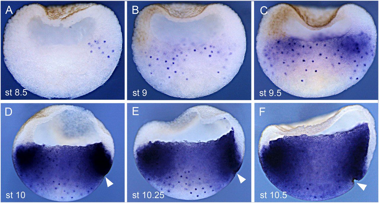 Fig. S3. mix1 mRNA localization in X. laevis embryos. The animal hemisphere is oriented toward the top, and the dorsal side is oriented to the right. Embryos were dorsally hemibisected before in situ hybridization. (AâC) Blastulae. (DâF) Gastrulae. White arrowheads mark the position of the dorsal blastopore lip.