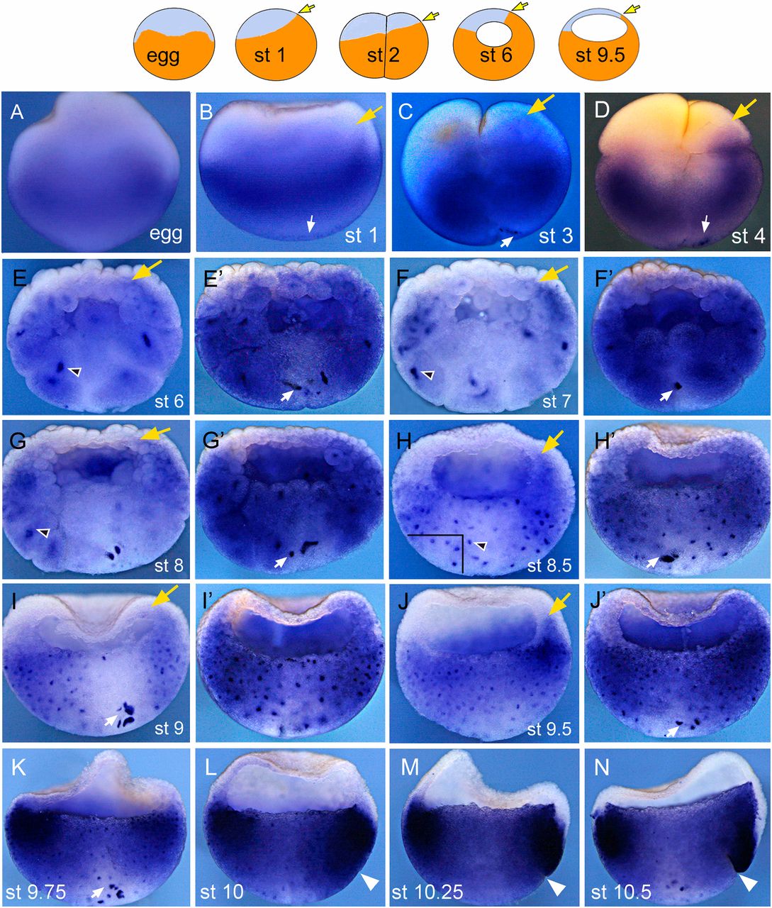 Fig. 3. vegt mRNA localization in X. laevis embryos. The animal hemisphere is oriented toward the top. In all embryos, dorsal is oriented to the right. Embryos were dorsally hemibisected before in situ hybridization. The row of diagrams summarizes the vegt expression of the unfertilized egg and st 1â9.5 embryos. The animal hemisphere of the egg and the blastocoel roof (shown in gray) were vegt-negative and the vegetal region (in orange) was vegt-positive. (A) The unfertilized egg. vegt mRNA was found in the vegetal hemisphere with a lower concentration toward the animal region. (B) The egg 1 h after fertilization. vegt mRNA was detected in the vegetal hemisphere with a displacement toward the dorsal-animal side. In addition, vegt transcripts were detected in irregular areas located at the vegetal pole and colocalized with the germ plasm. Germ plasm and mitochondria localization are shown in Fig. S4 EâG. (C) The four-cell embryo. (D) The eight-cell embryo. (EâK) Blastulae. (LâN) Gastulae. (EâJ) Lightly stained halfâblastulae after vegt in situ hybridization. vegt mRNA localized mainly around the nuclei of vegetal cells. The boxed area in H is shown at higher magnification in Fig. S2B. (Eâ²âJâ²) Darkly stained half-blastulae after in situ hybridization. The dark color of the embryos partially masked the vegt mRNA signal around nuclei in Eâ²âGâ² in comparison with the lightly stained half blastulae in EâG. Yellow arrows indicate the dorsoâanterior limit of vegt mRNA localization. White arrows at the vegetal region mark the accumulation of vegt transcripts in the germ plasm. Black arrowheads point to the accumulation of vegt transcripts in the central region of vegetal blastomeres. White arrowheads indicate the position of the dorsal blastopore lip.