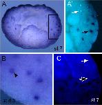 Fig. S2. vegt mRNA and protein localization in the X. laevis blastula. (A and Aâ²) Immune localization of VegT in a hemibisected blastula. (B and C) In situ hybridization of vegt mRNA in blastula hemibisections. (A) VegT immune localization. The boxed area is shown at higher magnification in Aâ². (Aâ²) VegT immune localization and DAPI nuclear staining of the embryo in A. The color reaction of VegT quenched the DAPI fluorescence in VegT-positive nuclei. In contrast, VegT-negative nuclei were brightly fluorescent. (B) Higher magnification of the boxed area of Fig. 3H. vegt transcripts were detected around less color-dense round structures, probably cell nuclei. (C) DAPI nuclear staining of a blastula after vegt mRNA in situ hybridization. Nuclei were brightly fluorescent in vegt-negative and positive blastomeres. vegt mRNA was detected around the brightly fluorescent nuclei. White arrows indicate vegt-negative nuclei. Black arrow points to the accumulation of VegT protein inside a nucleus. Black arrowhead indicates the accumulation of vegt transcripts around a cell nucleus. Black arrow with white outline points to the accumulation of vegt mRNA around a brightly fluorescent DAPI stained nucleus.