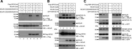 Figure 5. NCoR and KMT2D compete for binding to the SPOC domain of SHARP. (A) NCoR(wt) and NCoR-C(S2449D/S2451D) (upper panel, lane 4 and 6, respectively) but not NCoR-C(S2449A/S2451A) (upper panel lanes 5) were co-immunoprecipitated with SPOC(wt). HEK293 cells were transfected with the indicated expression constructs for Flag-tagged SPOC(wt) with NCoR-C(wt), NCoR-C(S2449A/S2451A) or NCoR-C(S2449D/S2451D) expression constructs. Expression was verified by Western blotting for NCoR proteins (middle panel, lanes 1–6) and the Flag-SPOC-domain (lower panel, lanes 4–6). (B) The C-terminal GFP- KMT2D-7b fragment coimmunoprecipitates with Flag-SPOC(wt) (upper panel, lane 2, see also Figure 1F, lane 1). The KMT2D-7b/ SPOC(wt) interaction is lost after coexpression of NCoR-C(wt) (1942–2453, upper panel, lanes 5). The SPOC(wt)/NCoR-C(wt) interaction can be verified by reblotting with an anti-NCoR antibody (RB: α-NCoR, lane 5). NCoR-C(d8) does not coimmunoprecipitate with SPOC(wt) (RB: α-NCoR, lanes 3 and 4) and does not displace KMT2D-7b from SPOC(wt) (upper panel, lanes 3 and 4). (C) NCoR(wt)/RBP-SPOC(wt) interaction is decreased after coexpression of KMT2D-7b (upper panel, lanes 2 and 3). The SPOC(wt)/KMT2D interaction can be verified by reblotting with an anti-GFP antibody (RB: α-GFP). NCoR-C(S2449D/S2451D) is not displaced from SPOC after coexpression of KMT2D-7b (upper panel, lanes 5 and 6). HEK293 cells were transfected with the indicated expression constructs for Flag- RBP-SPOC(wt), GFP-tagged KMT2D-7b, NCoR-C(wt) and NCoR-C(S2449D/S2451D). Expression was verified by Western blotting (lower panels WB: α-Flag, α-NCoR and α-GFP). The asterisk denotes the heavy chain of the antibody used for immunoprecipitation. |
