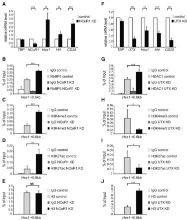 Figure 6. Competing occupancy of the KMT2D and NCoR complexes at Notch target genes. (A) NCoR1 knockdown was performed in mature T-cells by infecting them with pLKO.1 Scramble (Control) or pLKO.1 NCoR1 Sh1. Total RNA was purified and analyzed by qRT-PCR with primers specific for Hes1, Irf4 and CD25 Notch target genes, NCoR1 or TBP (TATA box binding protein) as control. Data were normalized to the housekeeping gene GusB (glucuronidase β). Shown is the mean ± SD of duplicate experiments measured twice each (**P < 0.01, ***P <0.001, unpaired Student's t-test). (B, C and D) As measured by ChIP, knockdown of NCoR1 in mature T-cells results in increased occupancy of (B) RbBP5 and increased levels of (C) H3K4me3 and (D) H3K27ac at the Notch-dependent enhancer of Hes1 Notch target gene. (E) As revealed by ChIP using a pan H3 antibody, nucleosome occupancy is not affected at the enhancer of Hes1 Notch target gene upon knockdown of NCoR1 in mature T-cells. Data were normalized to GAPDH 0kb and further normalized to histone H3 in the case of H3K4me3 (C) and H3K27ac (D). Shown is the mean ± SD of duplicate experiments measured twice each ([NS] not significant, **P < 0.01, ***P < 0.001, unpaired Student's t-test). (F) UTX knockdown was performed in mature T-cells by infecting them with pLKO.1 Scramble (Control) or pLKO.1 UTX Sh1. Total RNA was purified and analyzed by qRT-PCR with primers specific for Hes1, Irf4 and CD25 Notch target gene, UTX or TBP (TATA box binding protein) as control. Data were normalized to the housekeeping gene GusB (glucuronidase β). Shown is the mean ± SD of three independent experiments (**P < 0.01, ***P <0.001, unpaired Student's t-test). (G, H and I) As measured by ChIP, knockdown of UTX in mature T-cells results in increased occupancy of (G) HDAC1 and decreased levels of (H) H3K4me3 and (I) H3K27ac at the Notch-dependent enhancer of Hes1 Notch target gene. (J) As revealed by ChIP using a pan H3 antibody, nucleosome occupancy is increased at the enhancer of Hes1 Notch target gene upon knockdown of UTX in mature T-cells. Data were normalized to GAPDH 0kb and further normalized to histone H3 in the case of H3K4me3 (H) and H3K27ac (I). Shown is the mean ± SD of duplicate experiments measured twice each (*P < 0.05, ***P < 0.001, unpaired Student's t-test). |