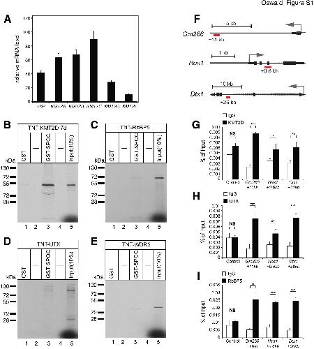 Figure S1. The KMT2D complex at enhancers of Notch target genes and interactions of KMT2D-complex components with the SPOC-domain of SHARP. (A) Relative expression levels of KMT2- family members and TBP mRNA in preT (Beko) cells. (B, C, D, E) GST-SPOC interacts strongly with cell free synthesized and 35S labeled KMT2D fragment (KMT2D-7b) (B), but not with cell free synthesized and 35S labeled RbBP5 (C), UTX (D) or WDR5 (E). (F) Notch-1 and RBP-J Chip-Seq data (accession# GSE29600) were analyzed in order to identify the enhancers of the Notch target genes Gm266, Hes1 and Dtx1, which respectively localize to +11kb, +0.6kb and +26kb regions relative to the transcription start sites (TSSs, grey arrows). Red boxes indicate the enhancer regions where our analysis was focused on. (G, H, I) ChIP experiments showing the occupancy of KMT2D (G), UTX (H) and RbBP5 (I), subunits of the KMT2D complex, at the enhancer regions of Gm266, Hes1 and Dtx1 Notch target genes. Shown are raw data represented as mean ± SD ([NS] not significant, [*] P < 0.05, [**] P < 0.01, [***] P < 0.001, unpaired Student’s t-test). |